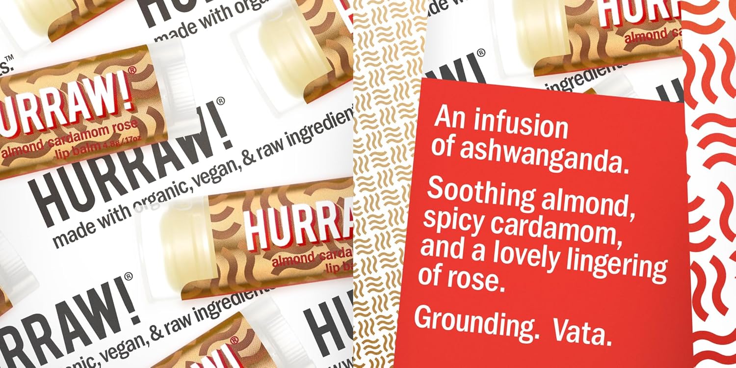 - THREE 4.8g/.17oz Oval Tubes packaged in a white HURRAW! branded pillow box. PITTA (Coconut, Mint, Lemongrass), KAPHA (Grapefruit, Ginger, Eucalyptus), VATA (Almond, Cardamom, Rose). Made with certified organic, vegan, and raw ingredients. Hurraw! Lip Balms are certified 100% all natural origin, cruelty and gluten free. Non-GMO. Bee, Shea, Soy and Palm Free.