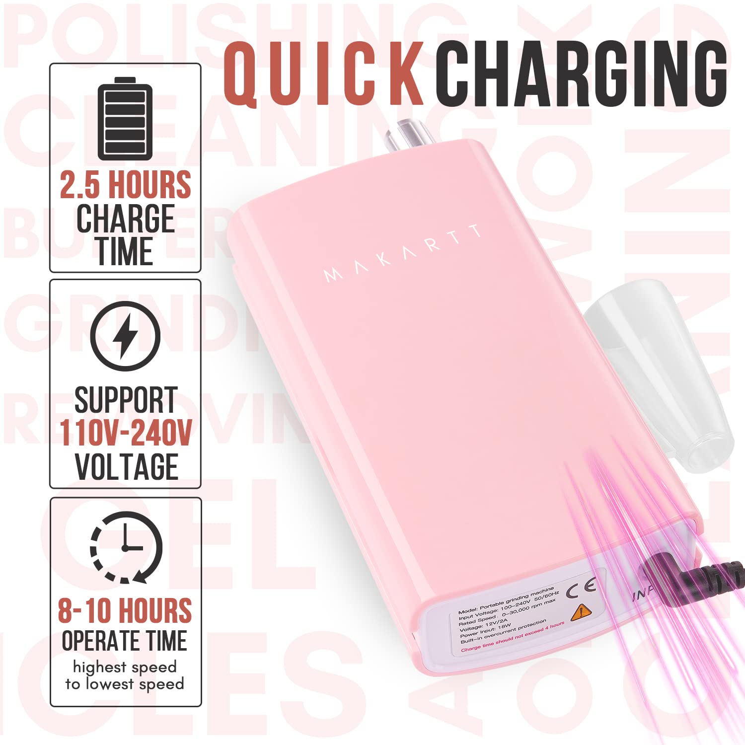 - Upgrade Nail Drill Kit - ①Casing now flame-retardant, enhancing fire resistance. ②Battery voltage boosted from 24V to 30V, improving durability. ③New buzz alert for charging above 15.5V, warns of danger and stops charge.