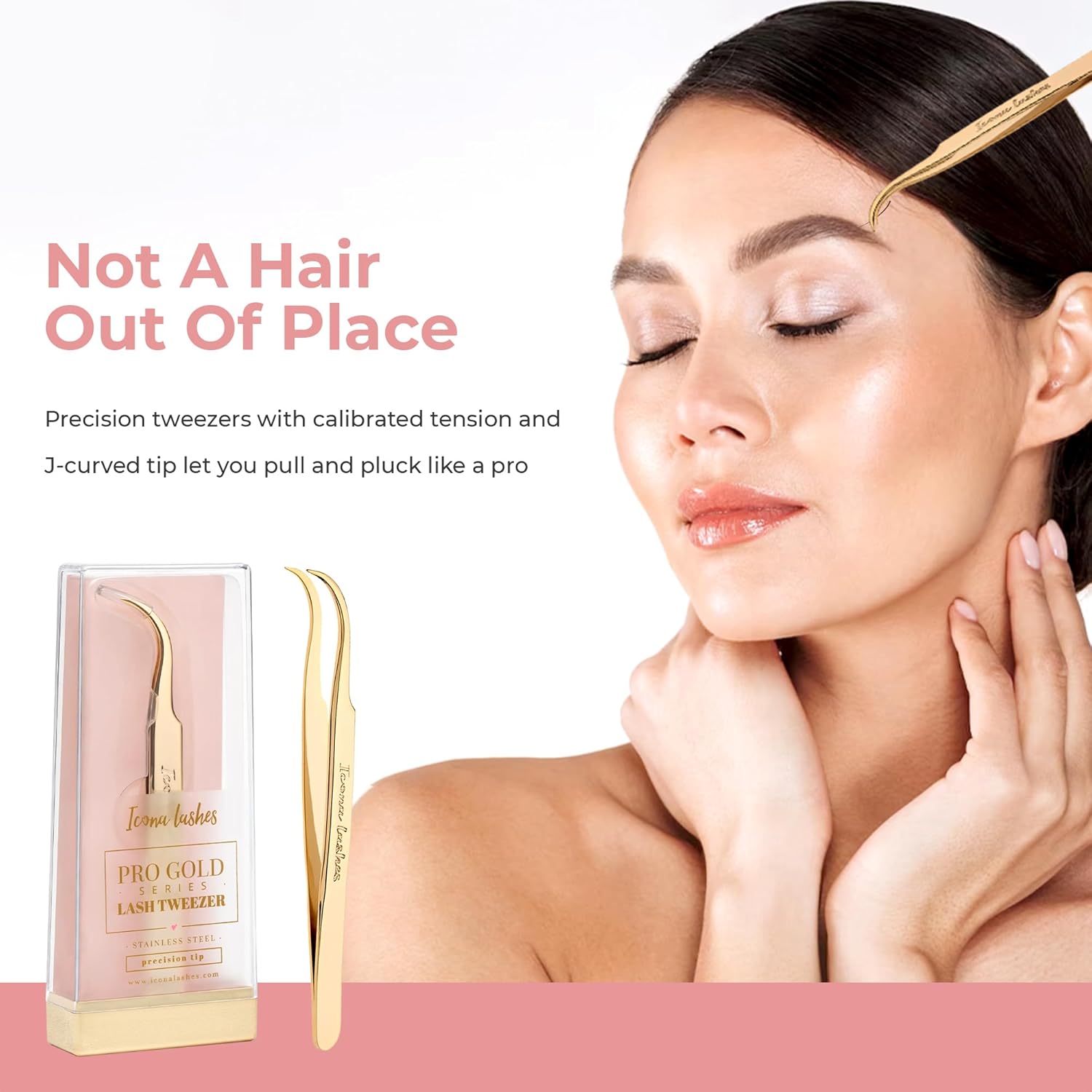Hair Removal & Eyelash Tweezer - J-curved Tip for Precise Plucking - Applicator Tool for False Eyelash Clusters & Lash Extensions - 24K Gold Plating, Stainless Steel - Case Included