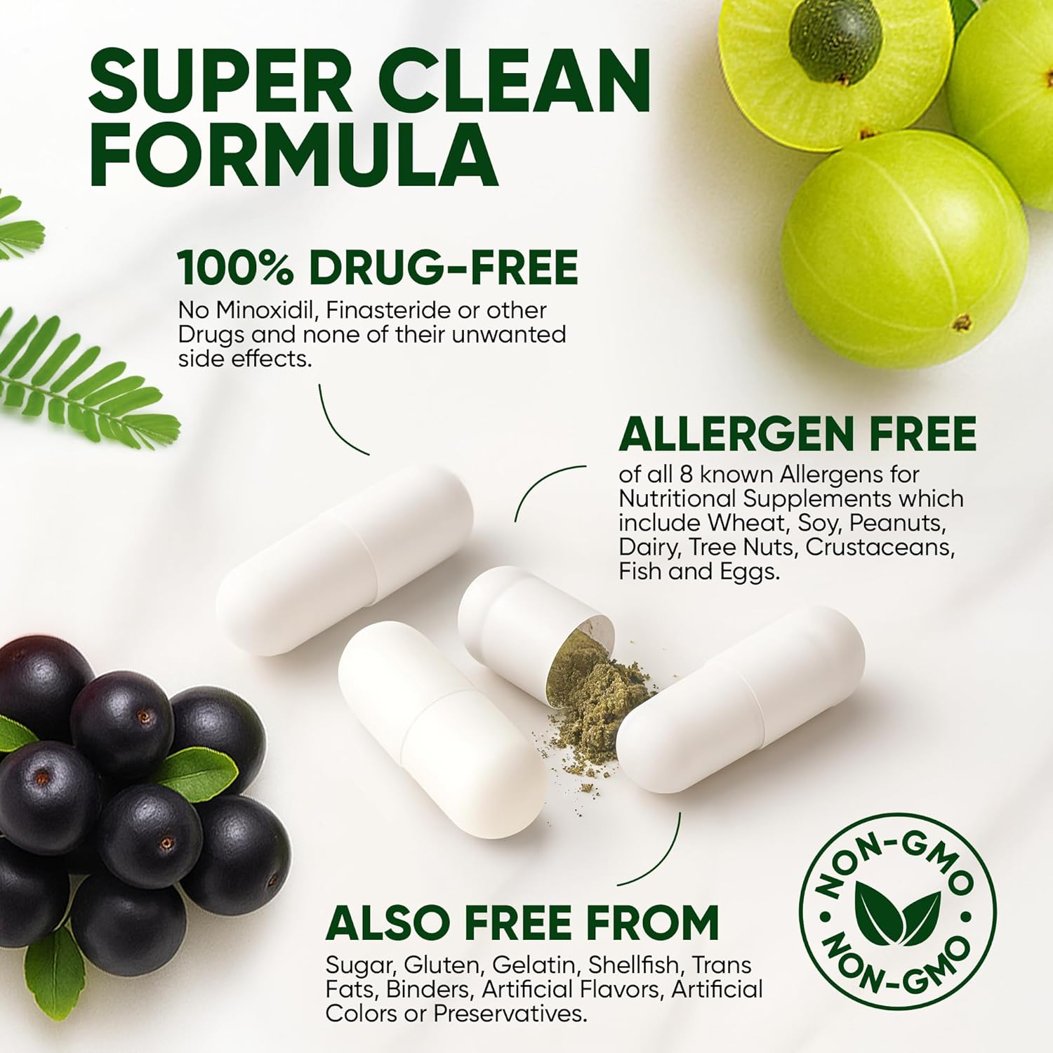- Natural and 100% Drug Free: A Clean Formula Hair Growth Supplement For Hair Thinning and Hair Loss; With No Minoxidil, No Finasteride, And No Side Effects