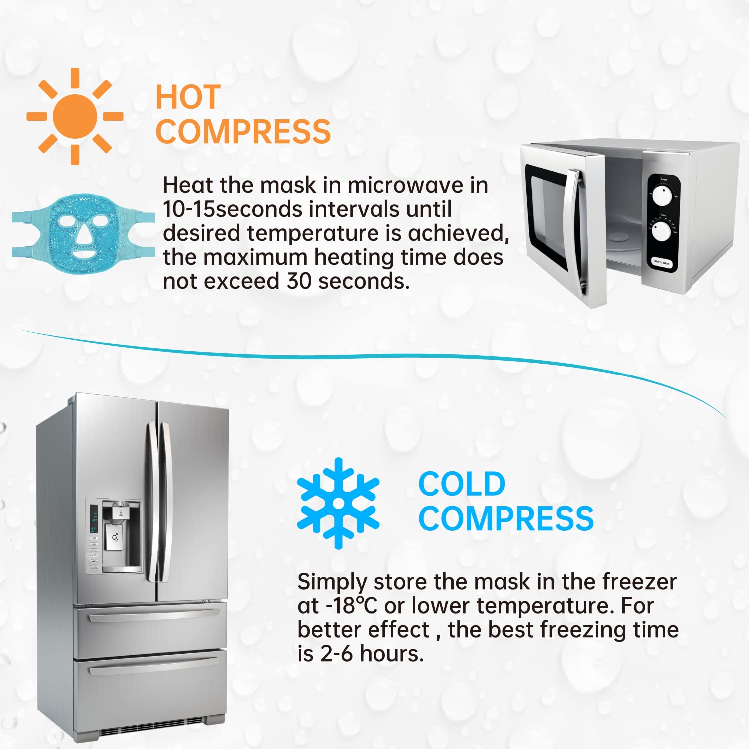 - 【CONVENIENT TO USE】simply store the mask in the freezer at -18℃ or lower temperature for at least 2 hours. Heat the mask in microwave in 10-15seconds intervals until desired temperature is achieved,the maximum heating time does not exceed 30 seconds.