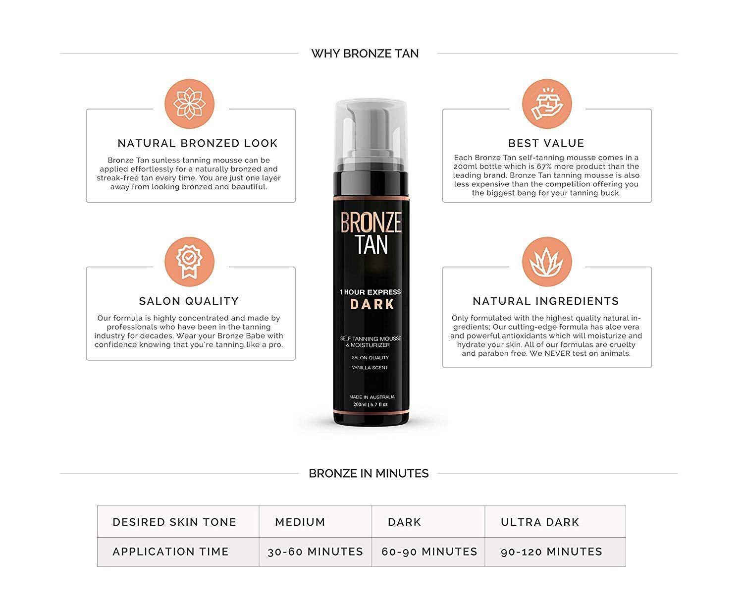 - No Need for Sunburn - Since Bronze Tan self tanning mousse requires no sunlight you can have a beautiful exotic glow without the risk of: wrinkles, sun-spots, sun damage, and skin cancer.