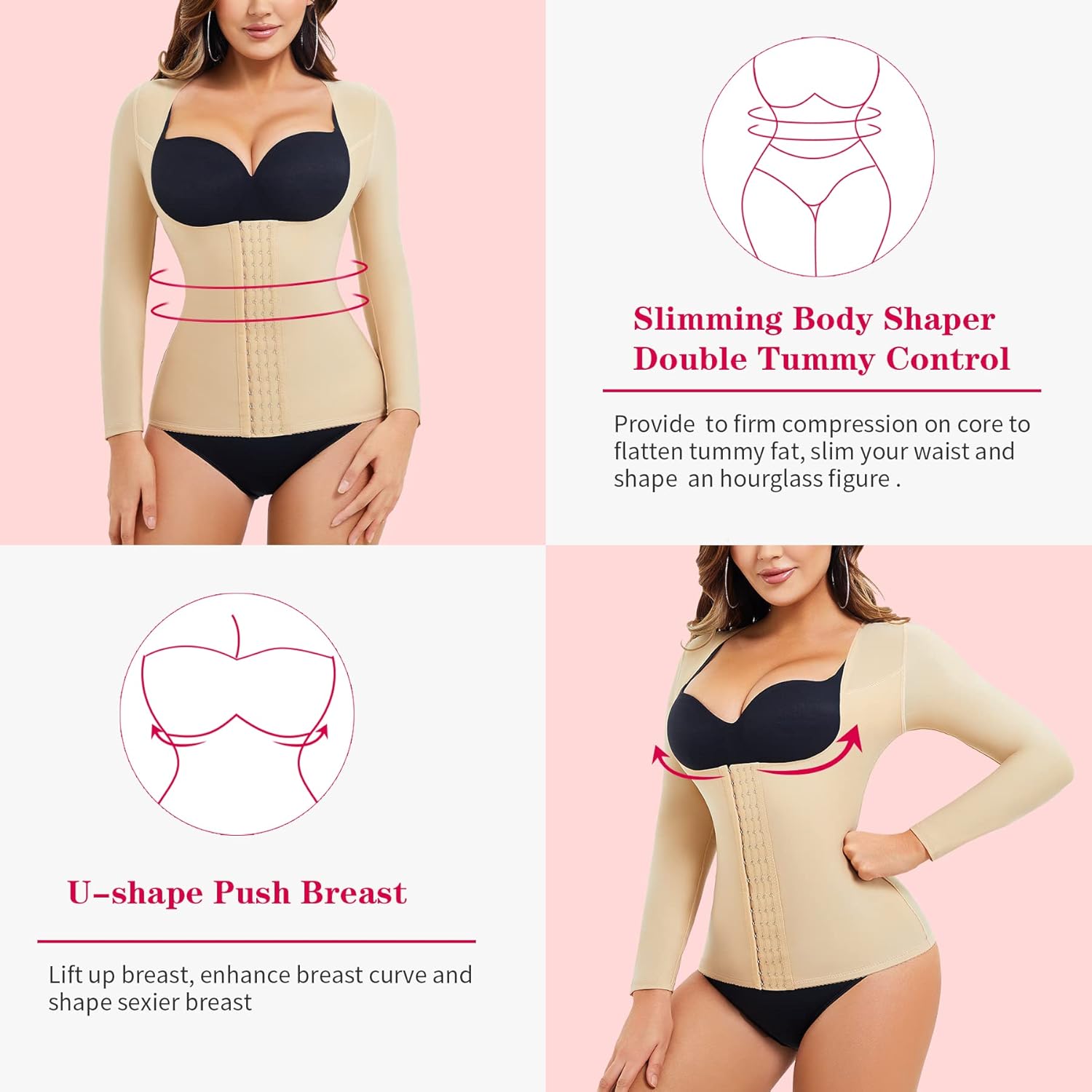 • HIGHLIGHTS THE CONTOURS OF THE BODY : this waist trainer bodysuit's middle part is 2-layer stretchy material,provide super high compression on tummy,hold stomach in,help reduce waistline and support back, front 4 hooks allow you to adjust the tightness you want, and U-shape push up breast design makes your chest more attractive, give you a beautiful hourglass figure.