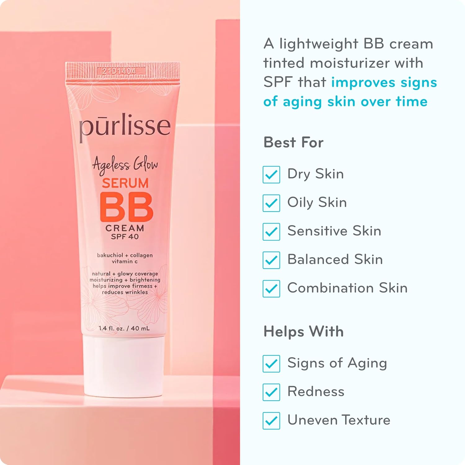 pūrlisse Ageless Glow Serum BB Cream SPF 40 - Glow BB Cream with SPF Enriched with Bakuchiol & Vitamin C to Help Improve Firmness & Reduce Wrinkles for Dewy Skin - Light Warm (1.4 oz)