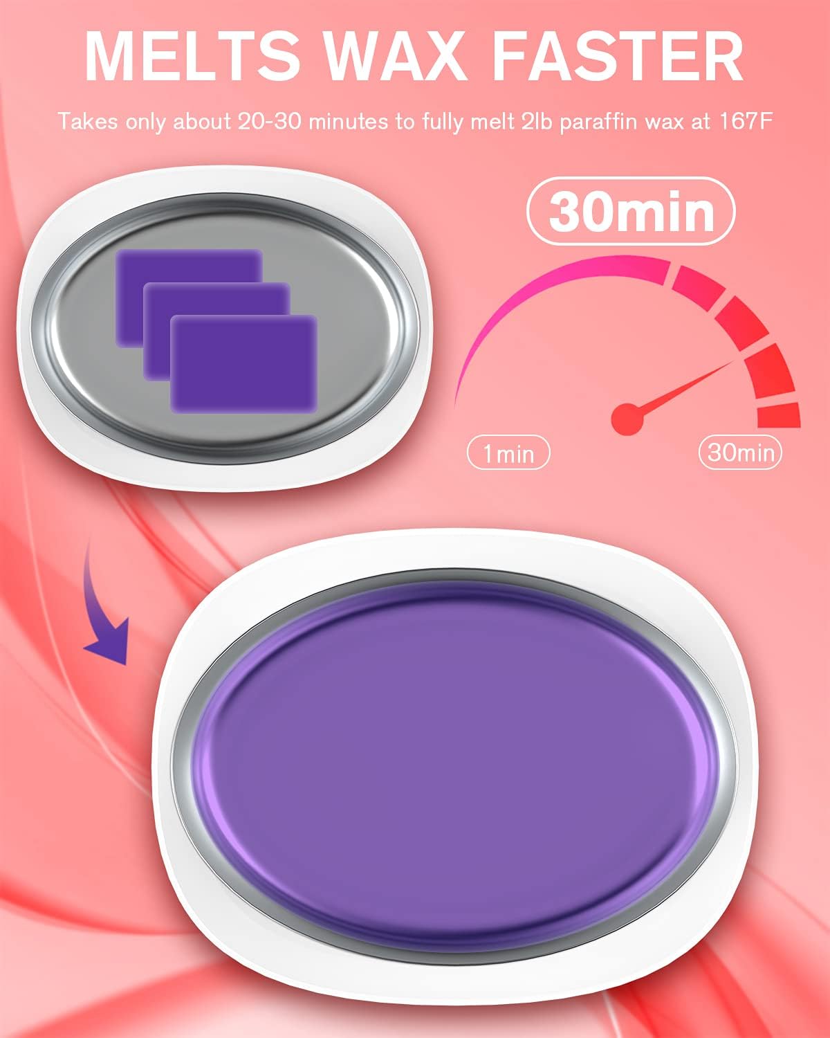 - Large Capacity / Quick Heat: paraffin wax machine has a large opening inner container , which offers you enough space to dip your hands, elbows or feet in paraffin warmer machine. Melts wax quickly and evenly , takes just 30 minutes to fully melt 2 lbs of paraffin wax at 167 °F. Turn Off the machine when dipping