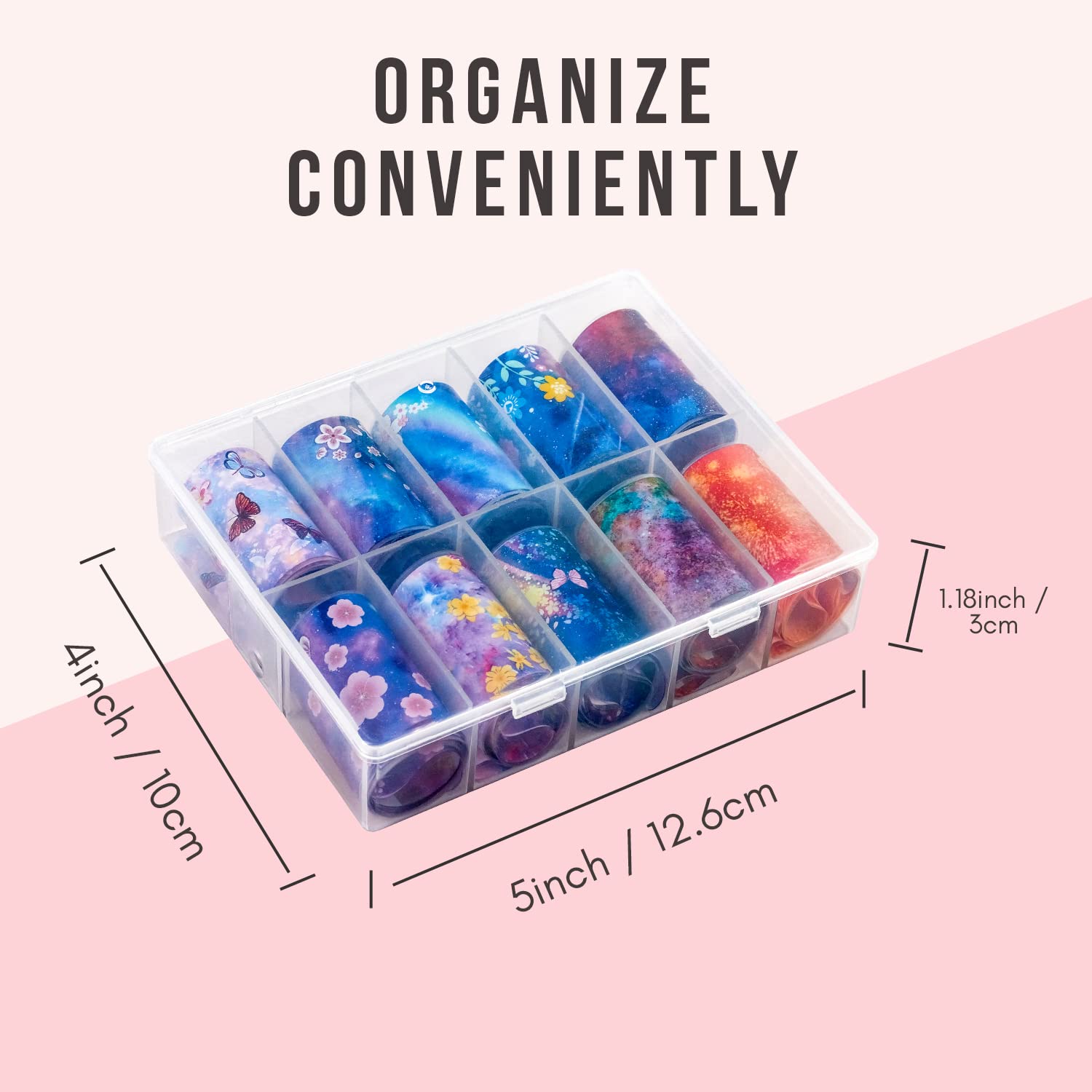 - PACKAGE INCLUDES: A box of 10 rolls of nail foil transfer stickers. Nail art Sticker size: 39.4inch x 1.57inch (100x4cm)