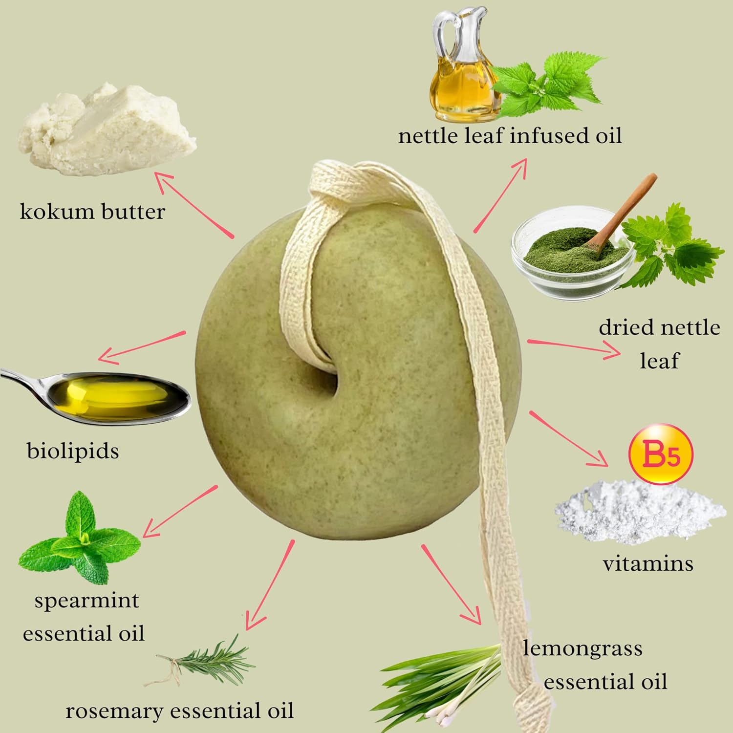 - Nettle leaf, kokum butter and essential biolipids and vitamin B5 promote healthy hair growth, volume, and strength.