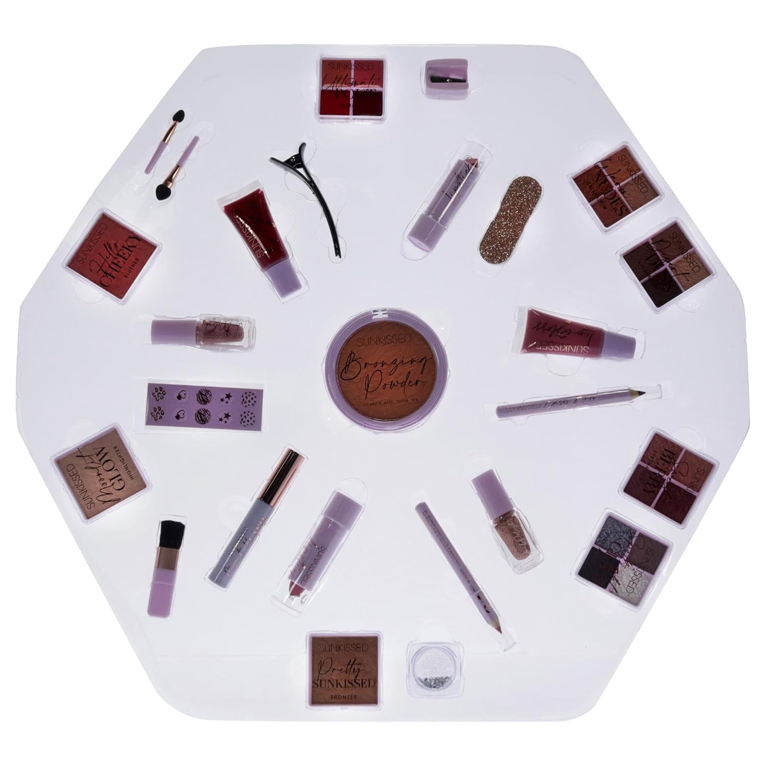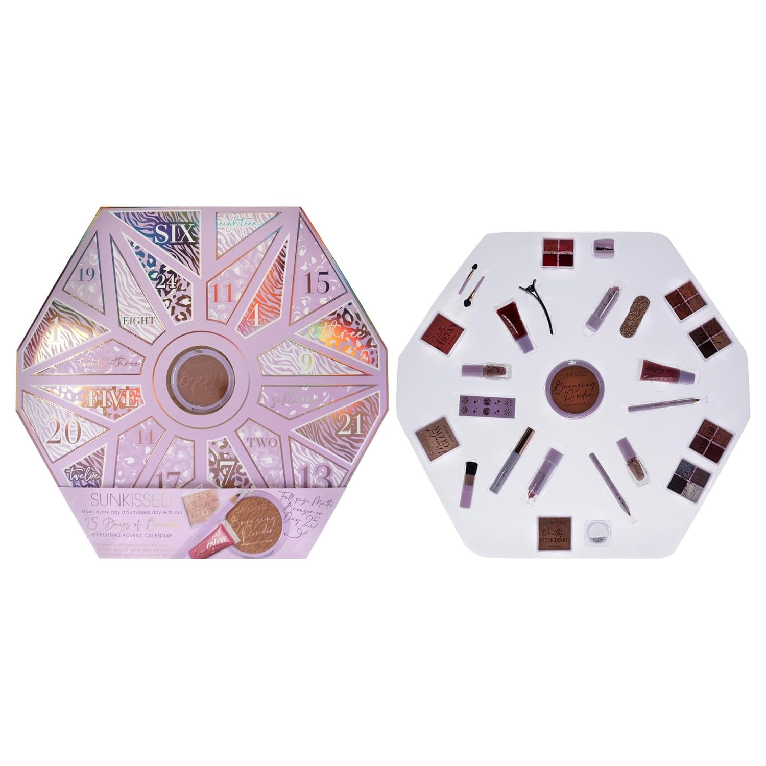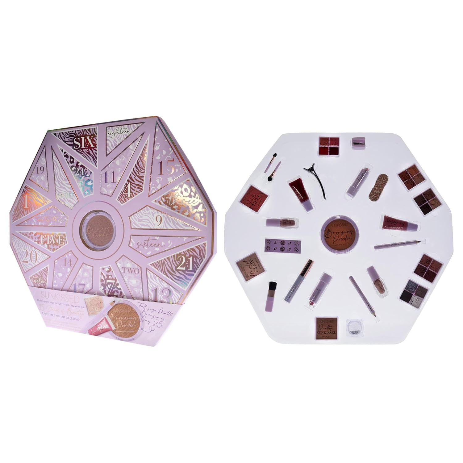 Sunkissed Christmas 25 Days of Beauty - Face, Lips and Eye Makeup - 2 Nail Polishes and 3 Cosmetic Brush Applicators - Vegan Formula - 25 Makeup Products and Accessories - 1 pc Gift Set