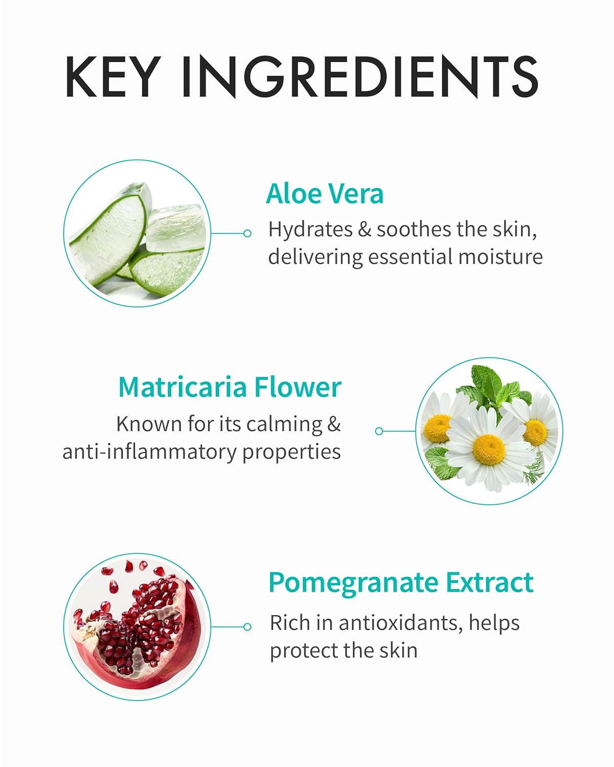 - HYDRATING INGREDIENTS: Aloe Vera, Matricaria Flower Extract, and Pomegranate Fruit Extract provide deep hydration and intense moisture. Aloe Vera soothes and calms, Matricaria Flower Extract reduces inflammation, and Pomegranate Fruit Extract offers antioxidant protection. This blend keeps skin soft, smooth and well-moisturized for a healthy, vibrant complexion.