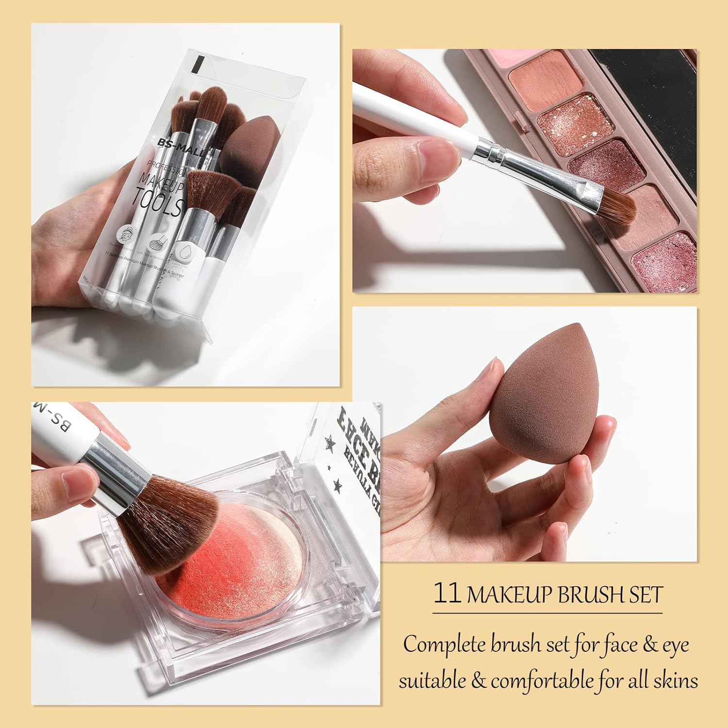 BS-MALL Makeup Brush Set 11Pcs Bamboo Synthetic Kabuki Brush Set Foundation Powder Blending Concealer Eye shadows Blush Cosmetics Brushes with Organizer Bag & Makeup Sponge (White)