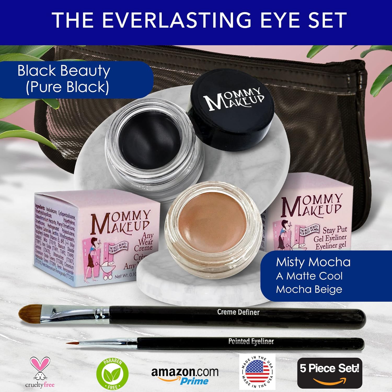 The Everlasting Eye 5 Piece Waterproof Makeup Set. Gel Eyeliner, Creme Eyeshadow, 2 brushes and Mesh Bag. Paraben-free, Talc-free, Cruelty-free. Misty Mocha/Black Beauty 1801