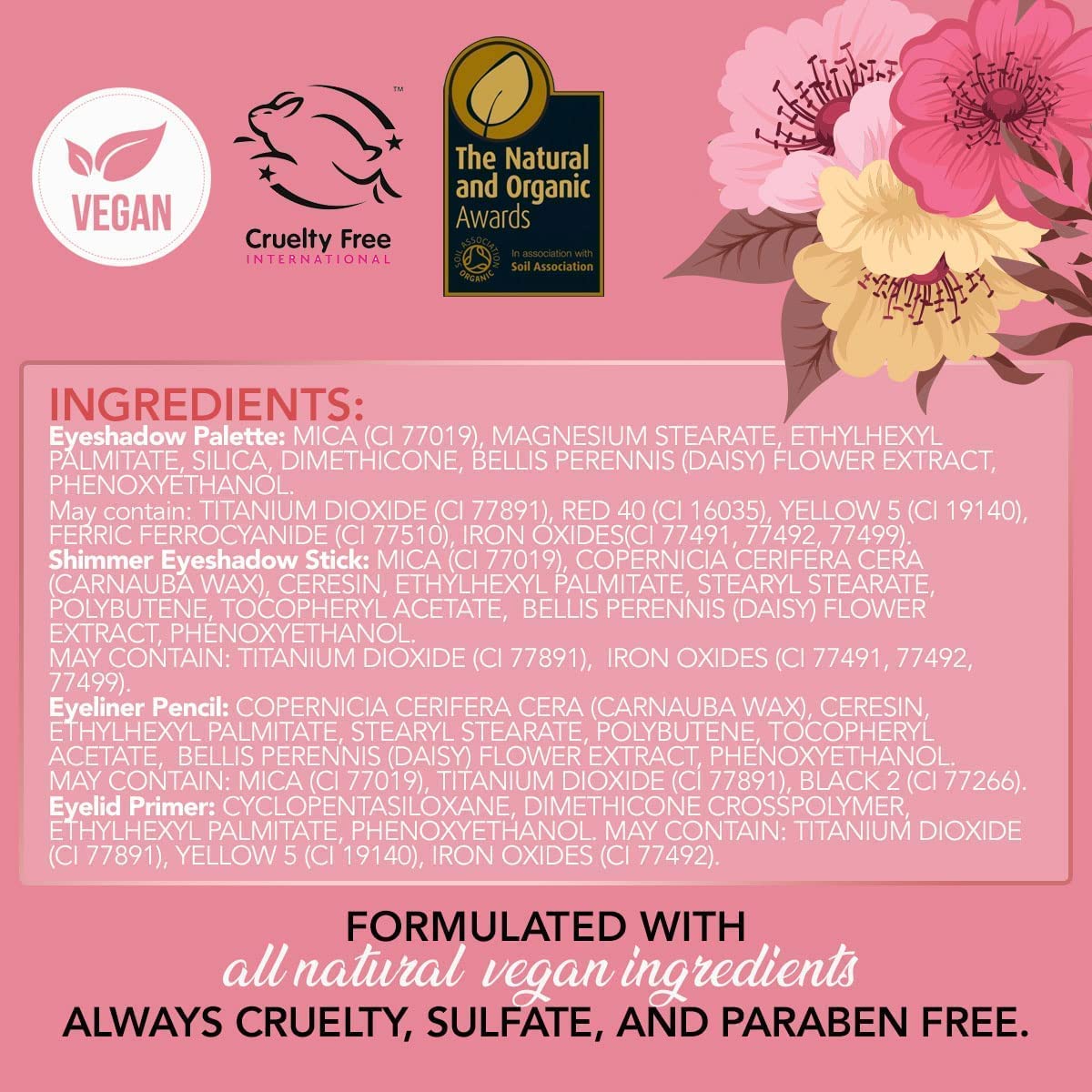 - EYE & LIP MAKEUP KIT - A vegan makeup collection that features a 4-Color Eyeshadow Palette, Shimmer Eyeshadow Stick, Eyeliner Pencil, and Eyelid Primer, all infused with daisy flower extract for added skin-nourishing benefits