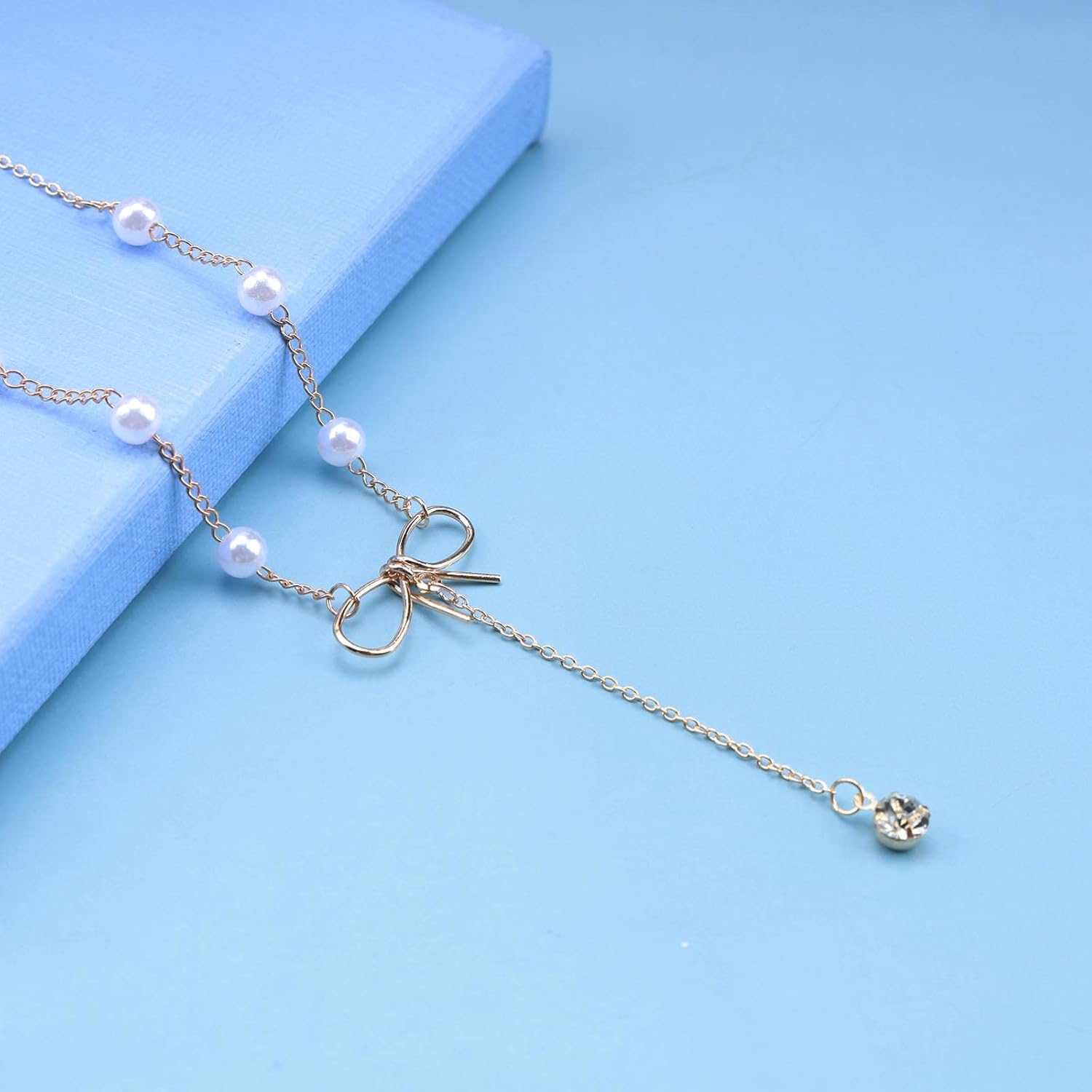 Bohemia Crystal Y Lariat Necklace Chain Pearl Beaded Choker Necklace Bow Knot Necklace Choker Gold Rhinestone Y Drop Necklace Chain Jewelry for Women and Girls