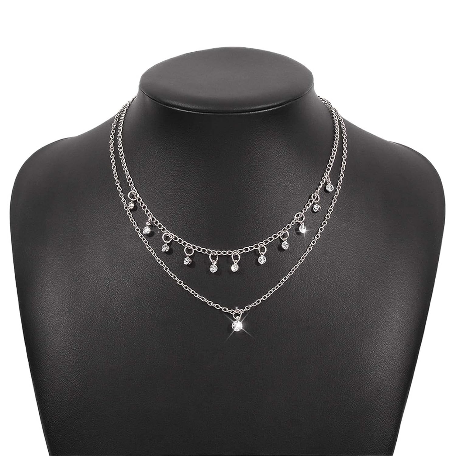 Boho Layered Silver Choker Necklace Crystal Pendant Necklace Rhinestone Tassel Choker Necklace Sparkly CZ Dangle Necklace Chain Jewelry for Women and Girls (Silver)