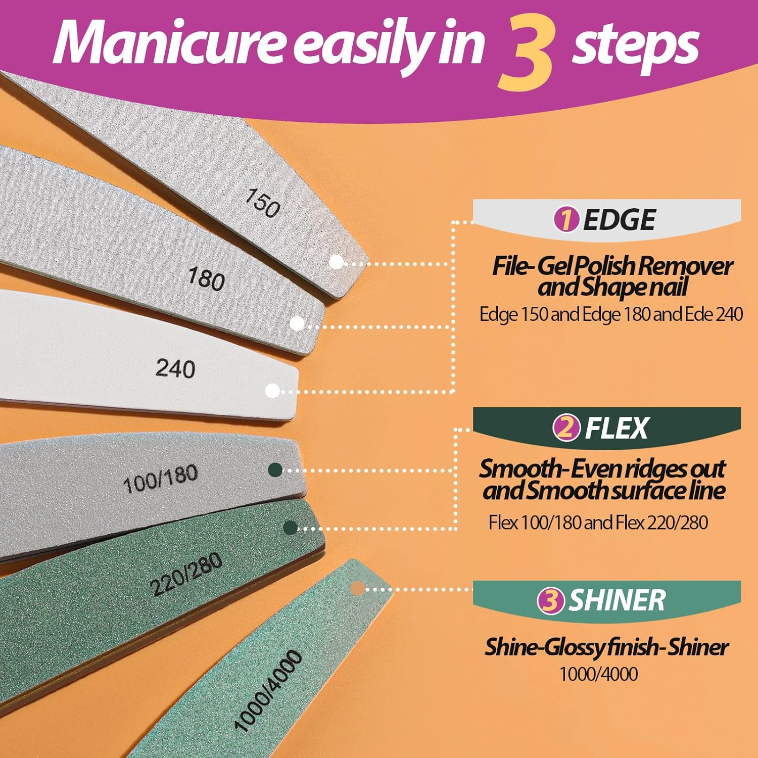 - 1000/4000 Grit Nail Filer to Get Shine Nails: Shine - Finish with this STEP 3 to further smooth the nails by 1000 grit side(green side), polish nail surface to create a high gloss shine in seconds by 4000 girt side(white side), which can last one week