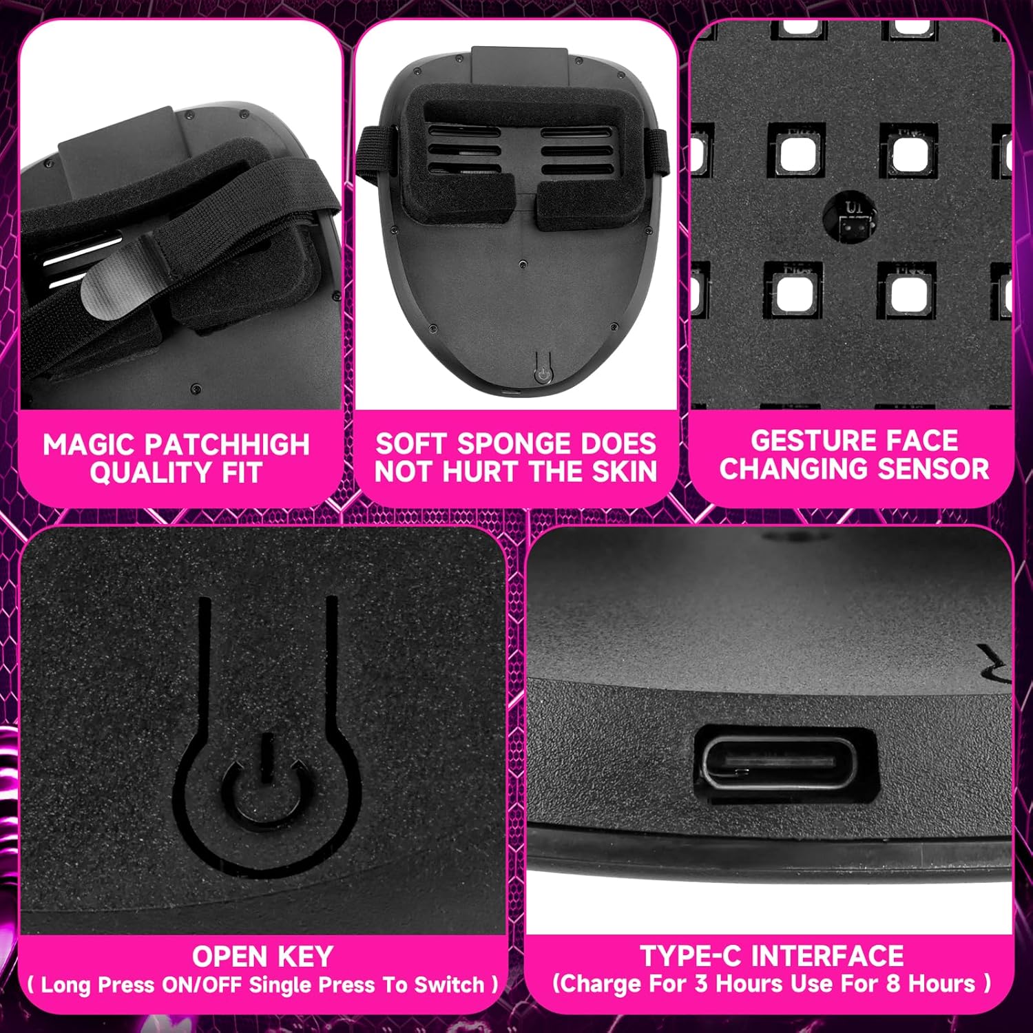 - Fun Technology Mask: Equipped with 234 high-lumen lamp beads and 3535 RGB LED lamp beads, our LED mask provides vibrant and eye-catching illumination. USB TYPE-C charging ensures 8-10 hours of continuous use after a 3-4 hour charge.