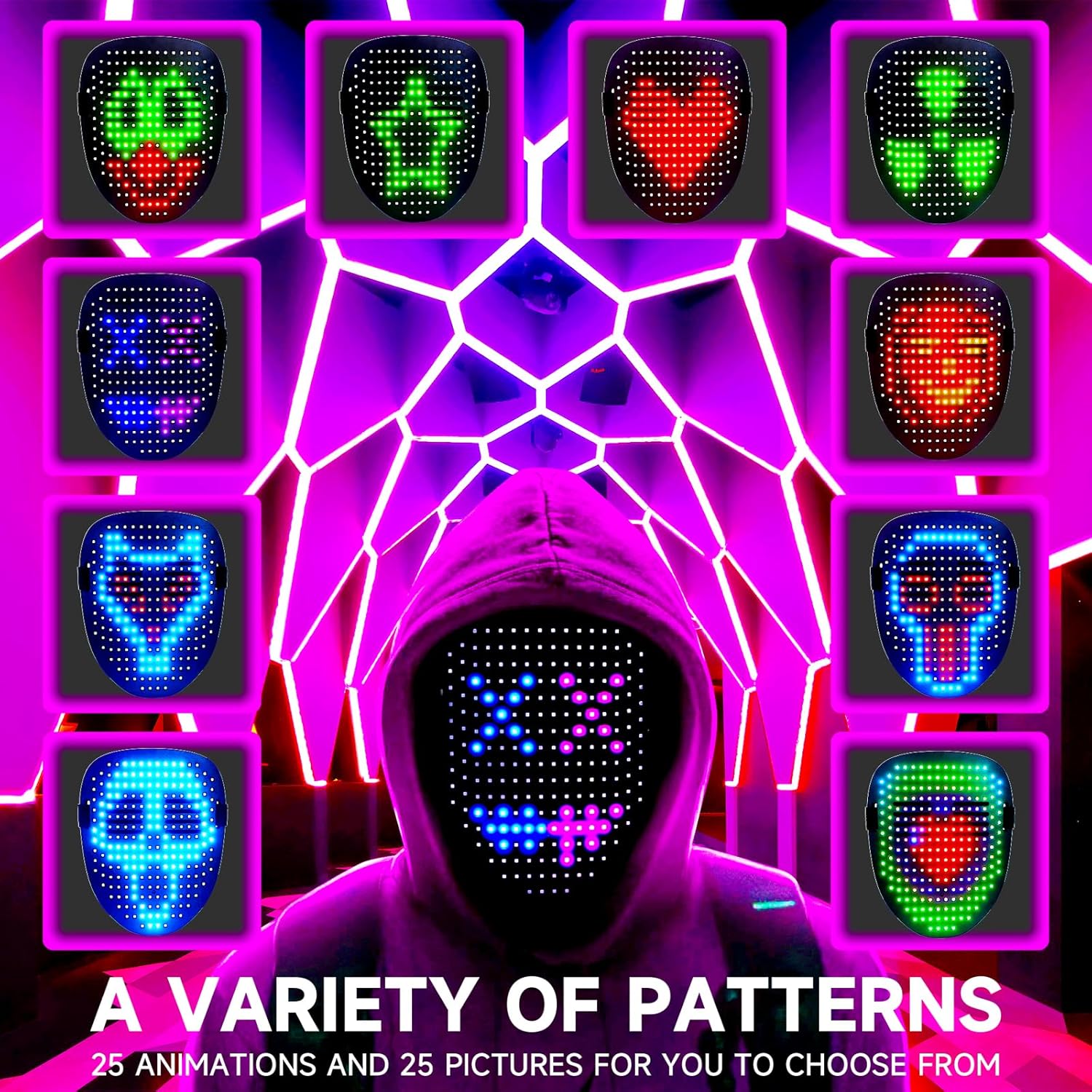 - 50 Patterns Fantastic Display: Featuring 25 dynamic and 25 static display patterns, this LED mask is perfect for any costume or cosplay event. Switch between patterns to captivate everyone's attention effortlessly.