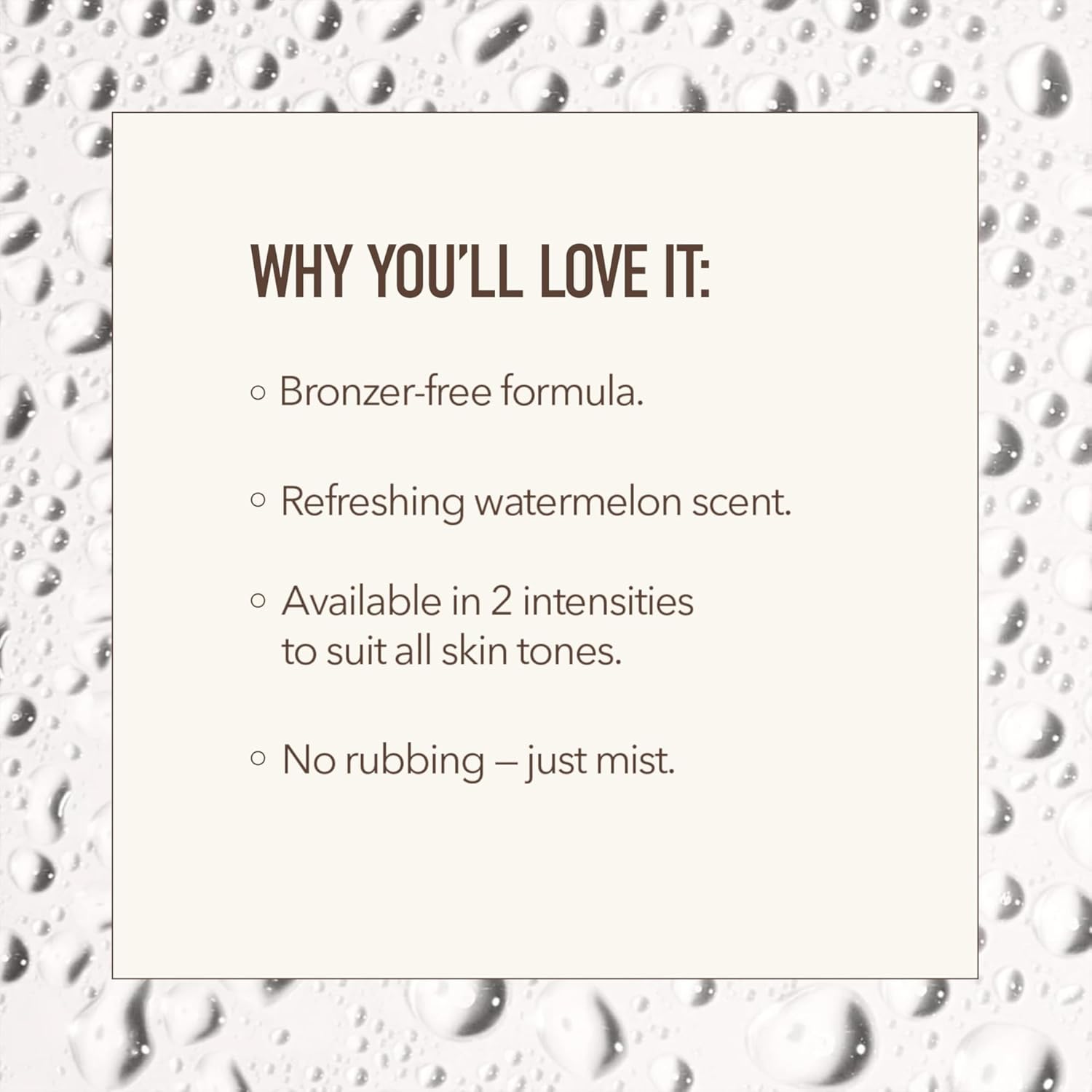 - CLEAN, REFRESHING & STREAK-FREE FINISH: Featuring a lightweight, bronzer-free formula, this alcohol-free tanning mist offers a transfer-free, mess-free experience with a refreshing watermelon scent. It’s non-comedogenic, non-sticky, and suitable for AM or PM application—perfect for layering under or over skin care and makeup without streaking or staining fabrics.