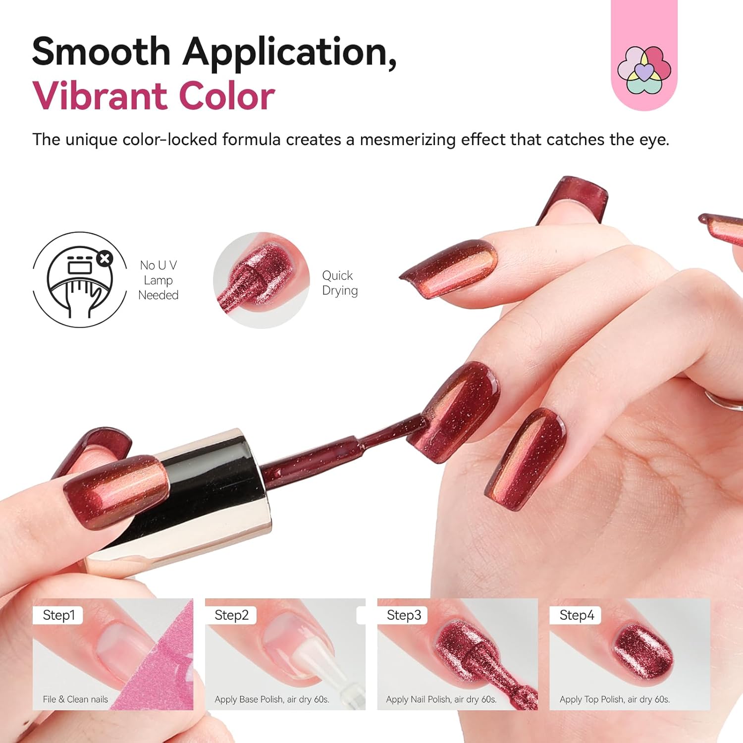 - Pro Tips: Cleanse nails and remove oils before application. Apply thin coats allowing complete drying between layers. Avoid water contact for 4+ hours post-application to prevent chipping and ensure 7-day wear