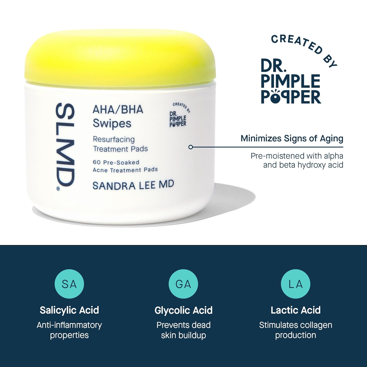 SLMD by Dr. Pimple Popper - AHA BHA Toner Pads Swipes, Salicylic Acid, Glycolic Acid & Lactic Acid - Daily Resurfacing Pads for Face & Body - Facial Exfoliating Pads Resurface, Treat, and Prevent Acne
