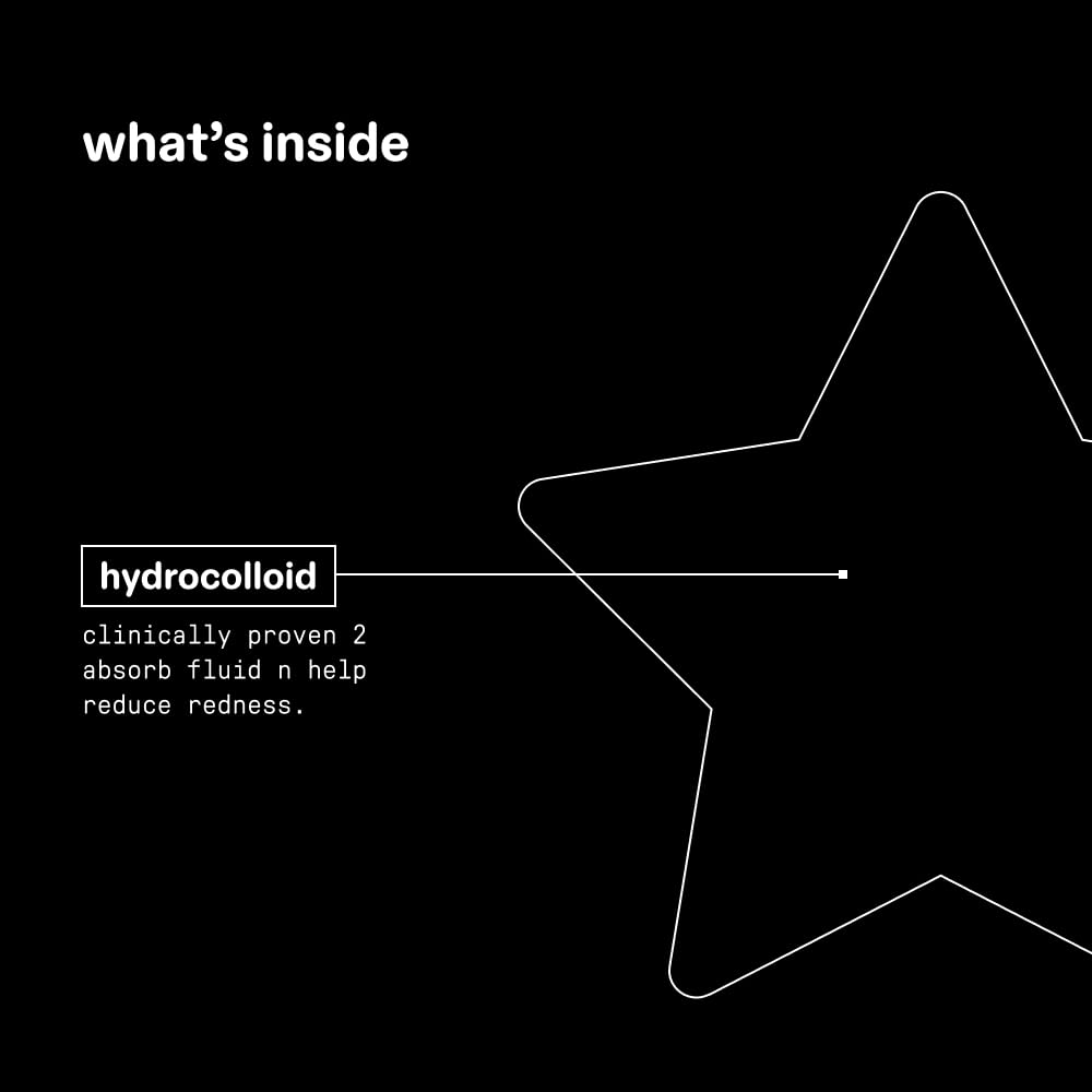 - CUTE & EFFECTIVE: Your favorite star-shaped pimple patches in a new black colorway. Made with 100% hydrocolloid to help absorb fluid, reduce redness, and shrink spots while looking cute.