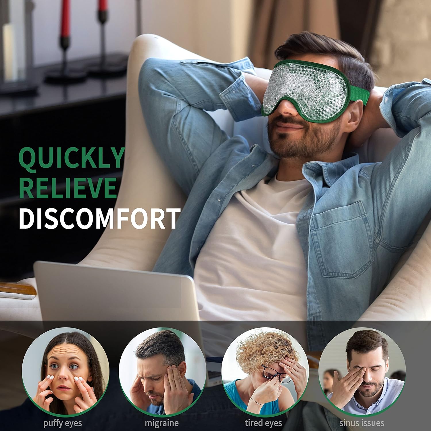 - RELIEVE DISCOMFORT: The gel bead eye mask is a quick and easy way to relieve your eye discomfort. Freezing the cooling gel eye mask and put it on your eyes to reduce puffiness from a night of poor sleep or a late night, or to relieve tired eyes that have been staring at a computer all-day