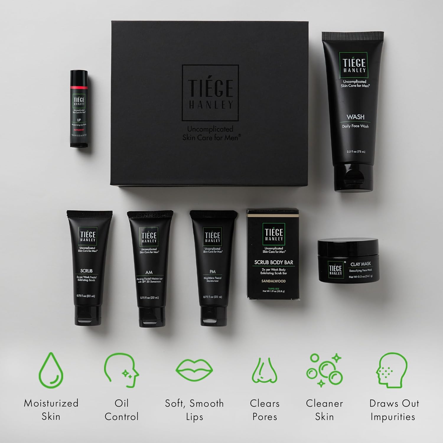 - Enhance Your Handsome: The Tiege Hanley Silver Gift Set is the ultimate indulgence for the modern gentleman who takes his skin care seriously. Includes face wash (2.5oz), AM moisturizer (0.75oz), exfoliating scrub (0.75oz), PM moisturizer (0.75oz), clay mask (0.5oz), sandalwood exfoliating body bar (1.9oz), and lip balm. This skin care gift set provides a 30-day supply, making it the perfect gift for holidays, birthdays, and other special occasions.
