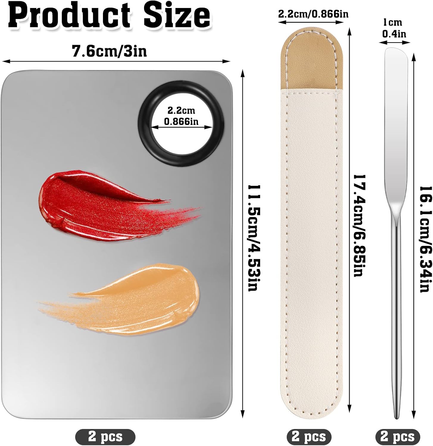 - Product Details: Our makeup palette set includes 2 pcs 10x14.7cm/3.94x5.79inches palettes,2 pcs 16.1x1cm/6.34x0.4 inches spatulas, 2 pcs 17.4x2.2cm/6.85x0.866 inches leather cases.The quantity is abundant to meet your daily needs.
