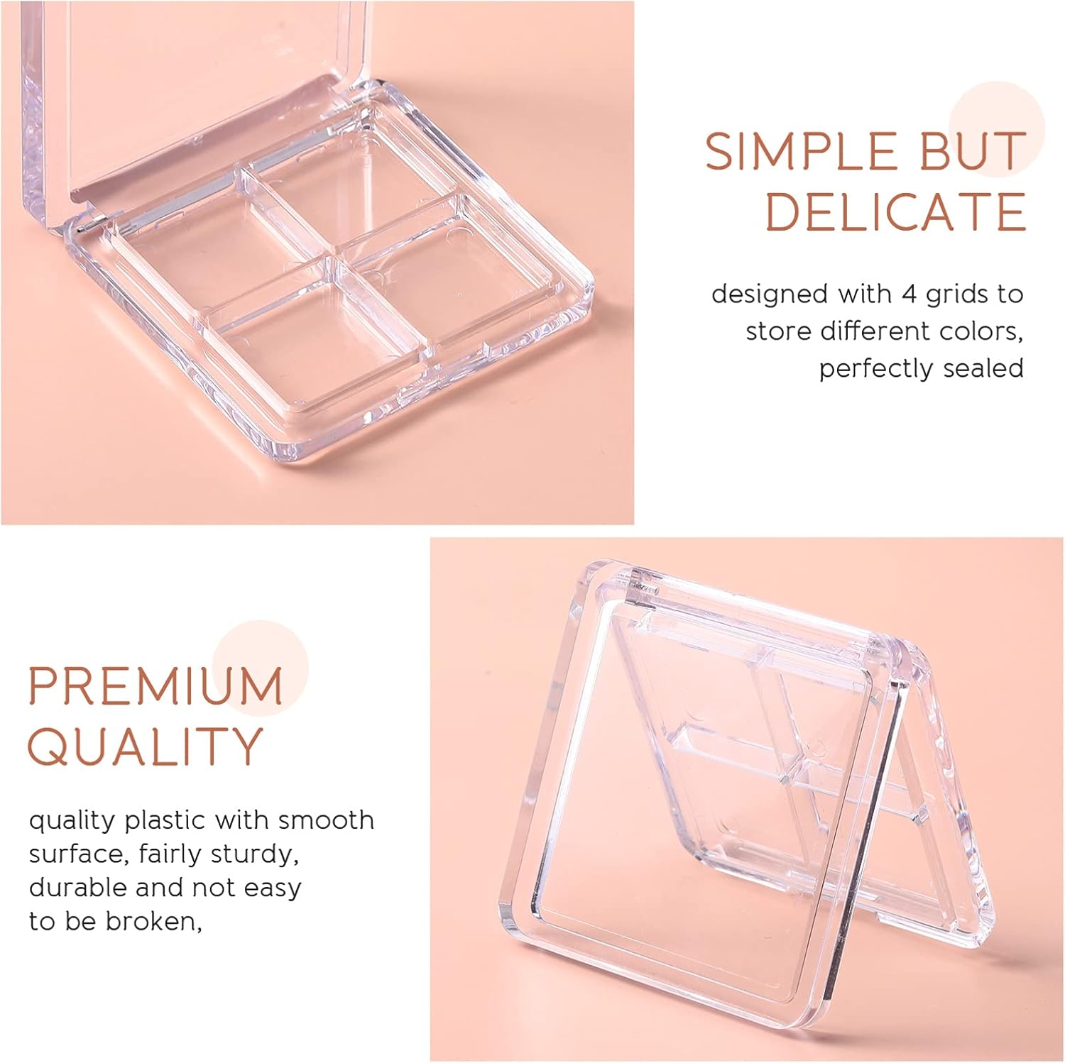 - 🎨💅【SIMPLE TO USE】Empty Eyeshadow Pallet, Refillable Eyeshadow Storage Case Box, Designed with 4 Grids to Store Different Colors, Simple but Delicate, Perfectly Sealed to Prevent Unnecessary Leakage.