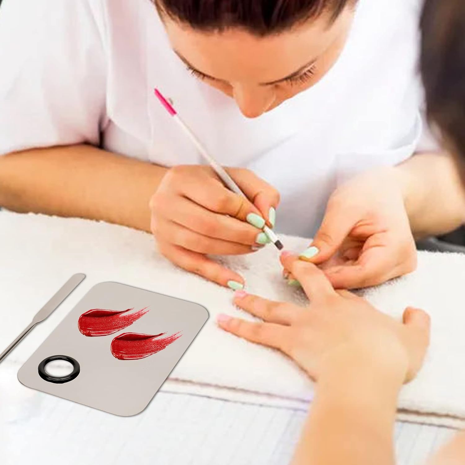 - Wide Application: The stainless steel spatula is ideal for professional salon or home use, and the palette can be used for make-up mixing and DIY nail art. Ideal for mixing foundation or eye shadow, nail polish, pigments, lash glue, etc. The plate can also be used as a mirror