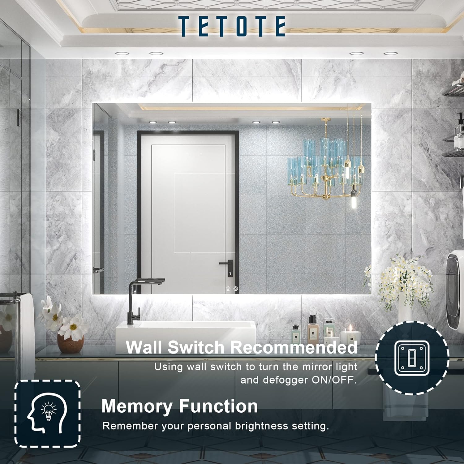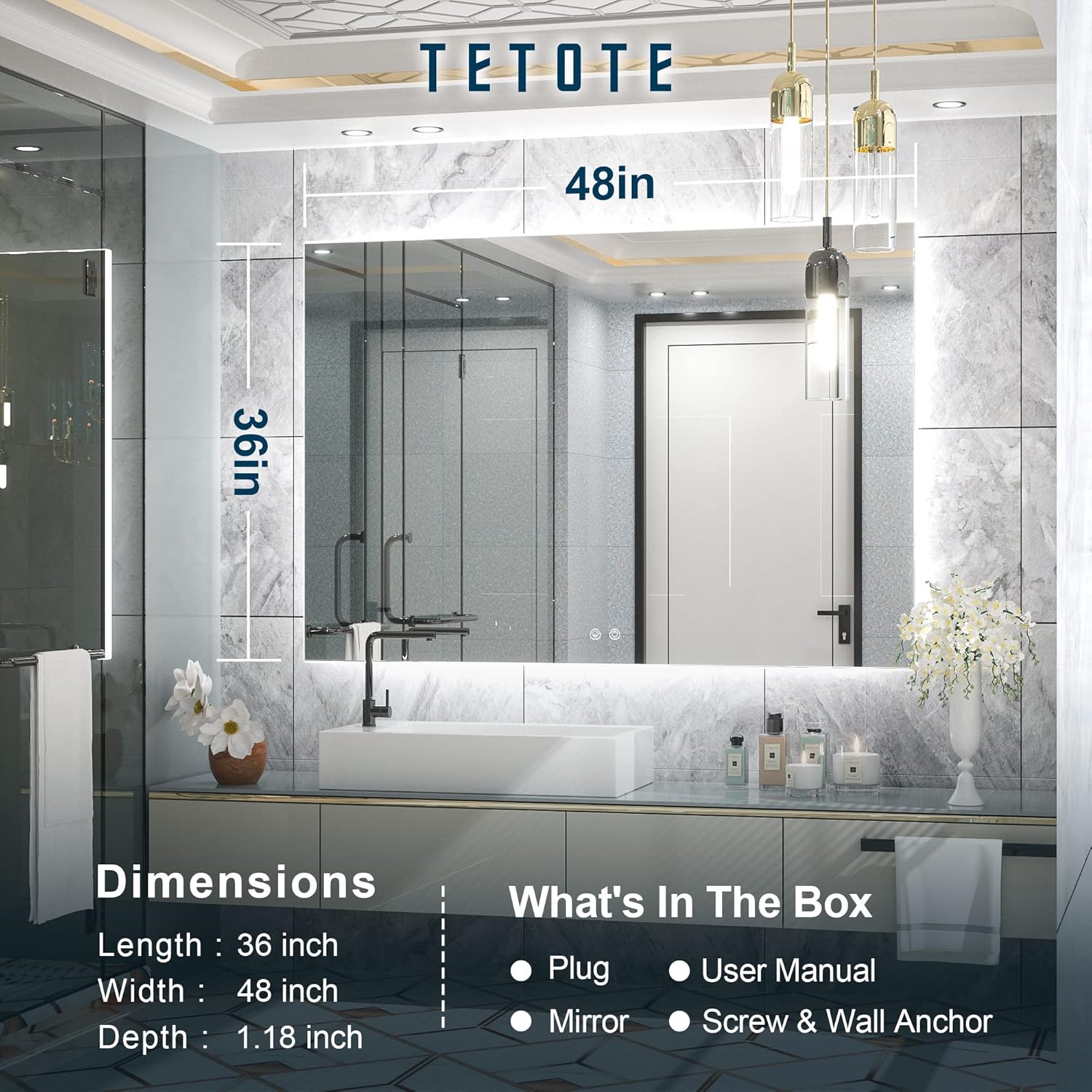 TETOTE 48 x 36 Inch LED Backlit Bathroom Mirror with Lights, LED Vanity Mirror, Frameless, Anti-Fog, Dimmable, CRI90+, Touch Button,Water Proof, Horizontal/Vertical Wall Mounted