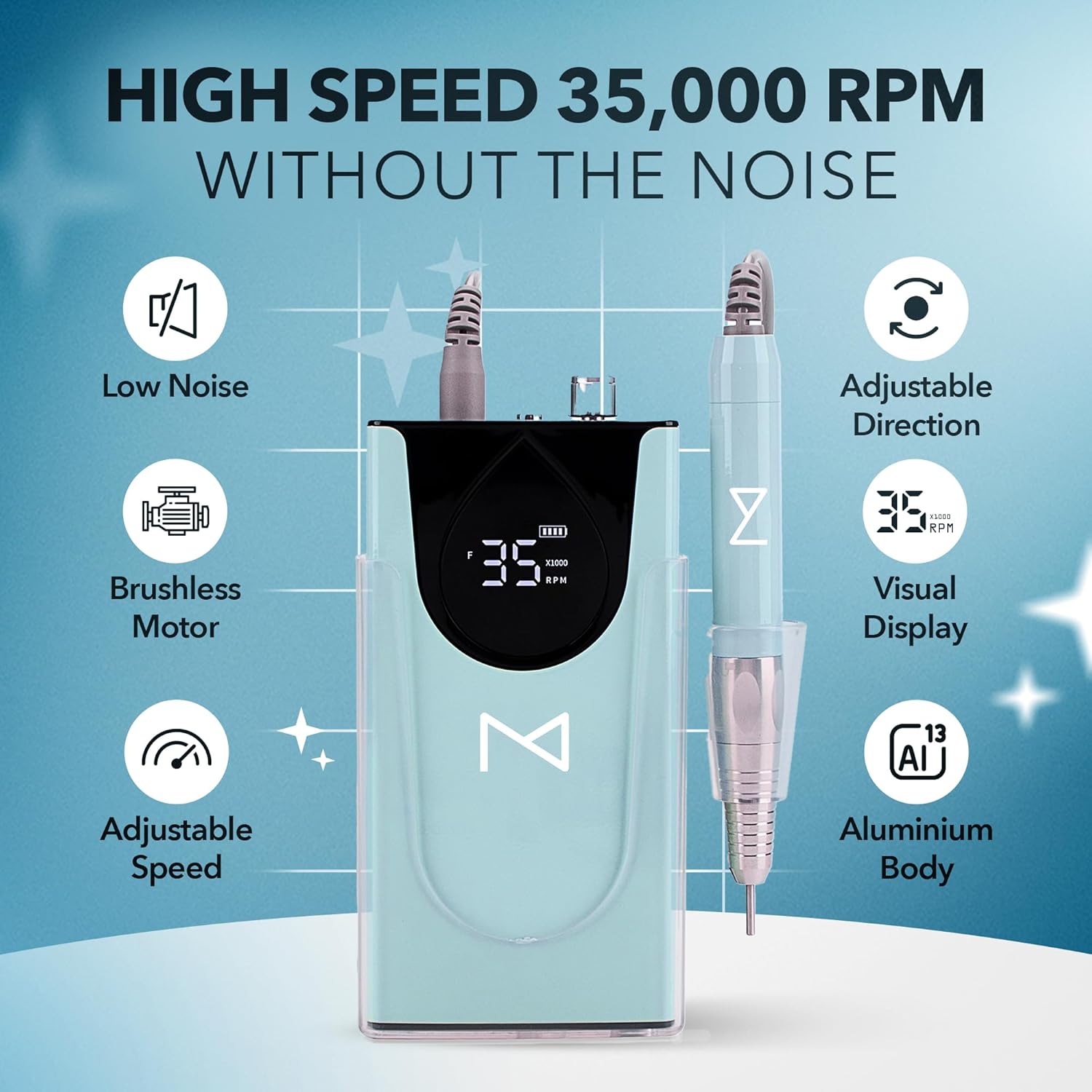 M Max - Professional Nail Drill Machine - 2-in-1 Brushless Motor Nail File - Electric, Cordless, Aluminium Alloy Casing, 35000 RPM, HD Display - Perfect for Salon & Home Use (Mermaid)