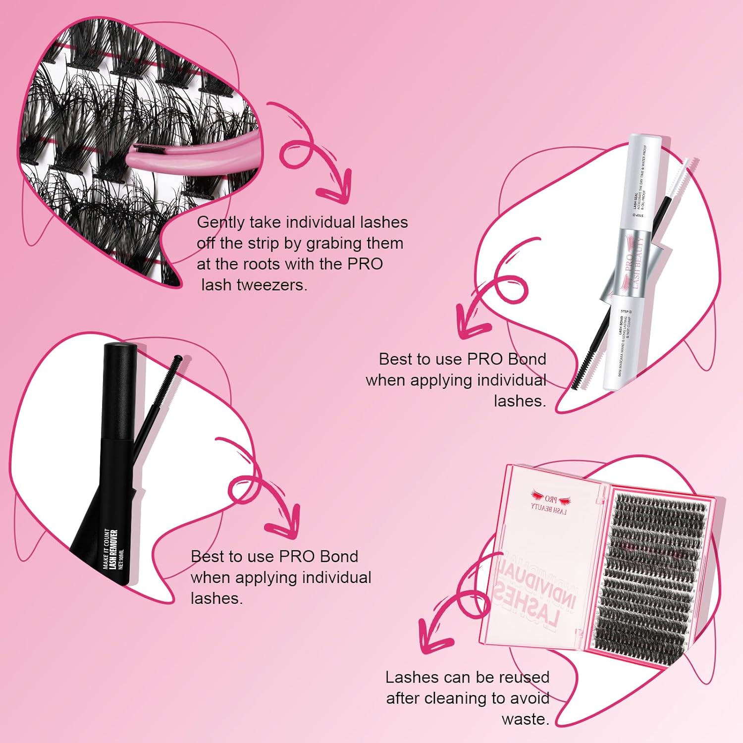 - Easy to Apply: Use the Bond-Side of PRO Bond & Seal to brush on your natural lashes. 1-2 mm away from your eyelid and wait for 30 seconds. And then ,gently take laehes by grabing them at the bands. After apply them to your natural lashes underneath your natural lashes, 2-3mm away from your eyelid. Finally, use the Seal-Side of PRO Bond & Seal to brush lashes and use the lash overnighter sealer to maintain beauty for a long time.