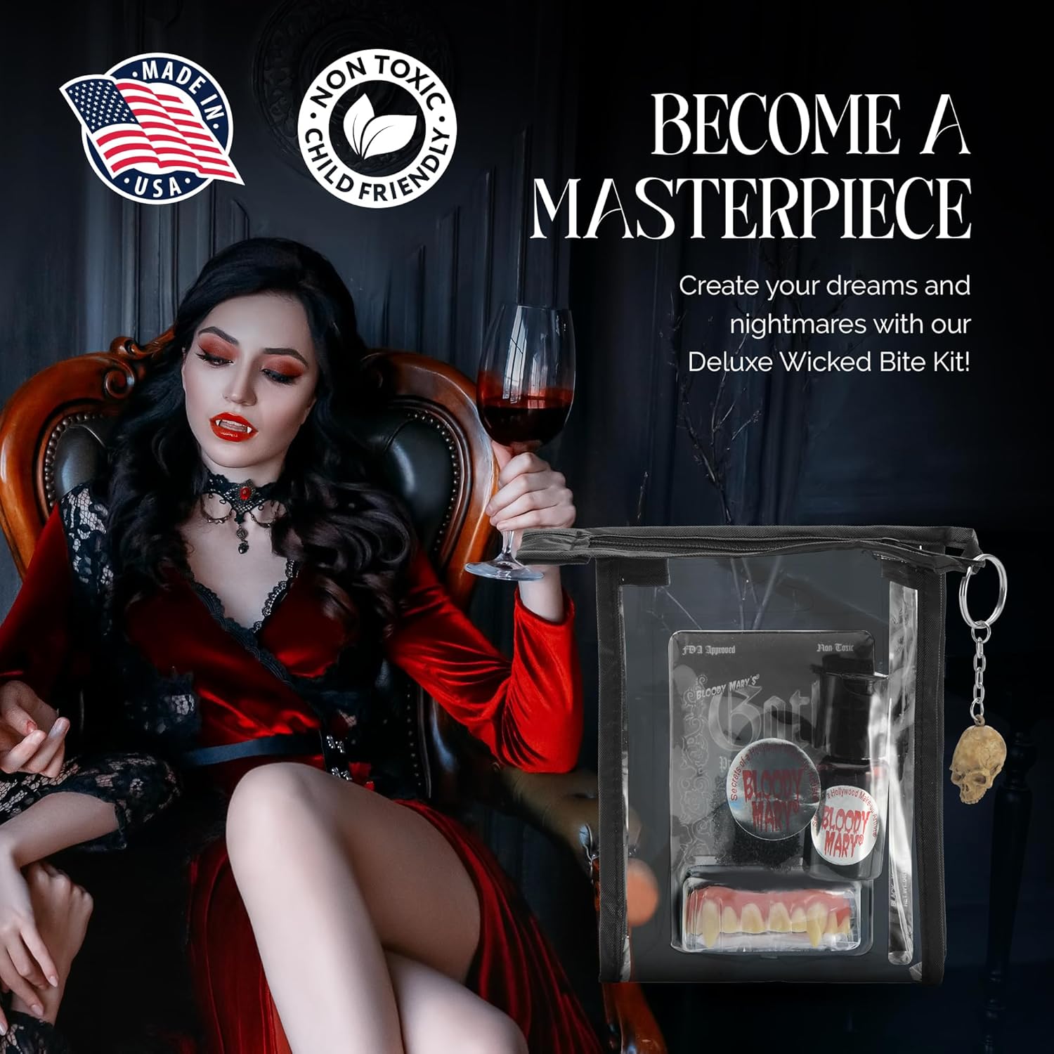 Vampire SFX Makeup Kit - Deluxe Wicked Bite Special Effects Face Makeup with 1/2 Oz. Extra Thick Fake Blood, Black Pencil Liner, Vampire Fangs and Stipple Sponge for Halloween or Stage - Bloody Mary