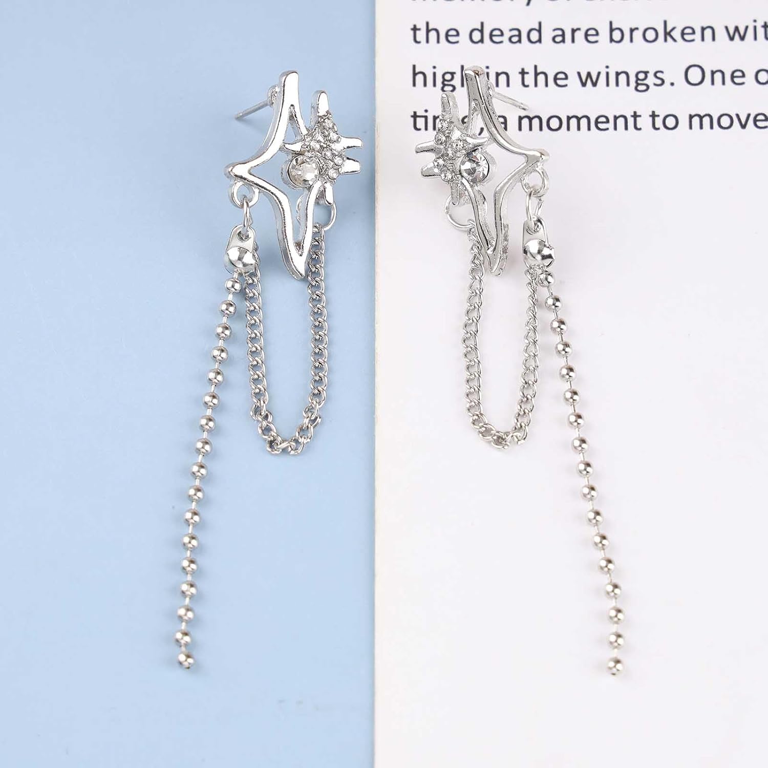 Vintage Crystal Northstar+Chain Drop Earrings Silver Tassel Chain Earrings Rhinestone Northstar Stud Earrings Long Beaded Chain Tassel Earrings Jewelry for Women