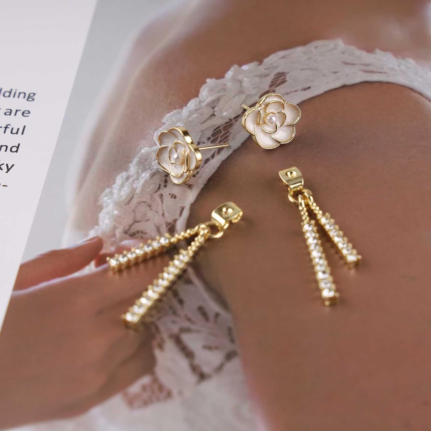 Vintage Crystal Flower Drop Earrings Pearl Camellia Earrings White Camellia Stud Earring Gold Linear Rhinestone Earring Jewelry for Women