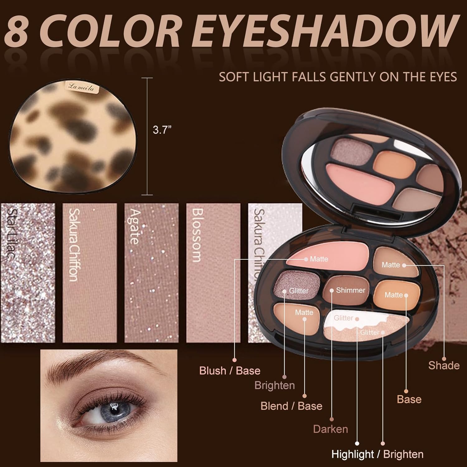 - 💄ALL IN ONE MAKEUP KIT FOR GIRLS - 1 x 8 colors nature tone, multi-purpose eyeshadow palette, 1 x waterproof and smudge-shield mascara, 1 x waterproof and smooth liquid eyeliner(friendly to newers), 1 x eyebrow soap(set brows all day), 1 x mesh cosmetic bag(portable & easy to find makeup stuff), 1x double-head lip gloss, 1 x 7pcs Soft Makeup Brush Set. The simple make up set is perfect for makeup artists or starters & beginners achieving a full-face flawless, natural & nude eye makeup effect.