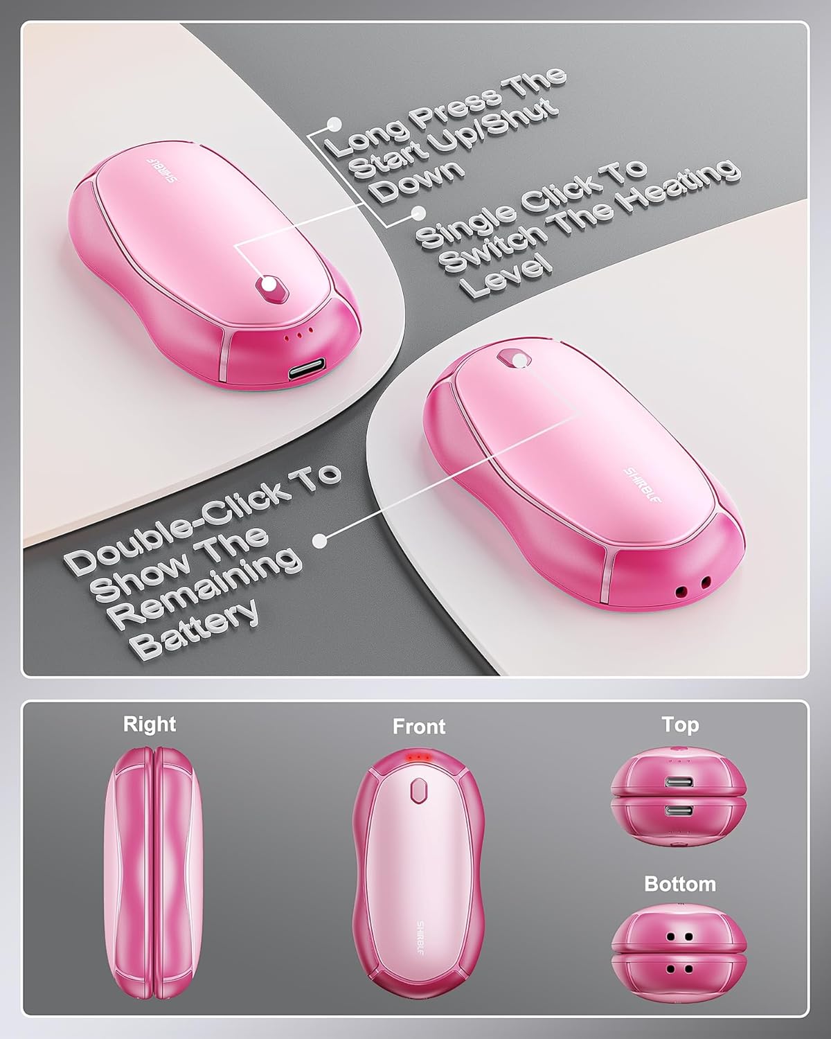 - 【Battery Level Alert】Double tap the on button at the top of the rechargeable heater to check the power level. When the handwarmer is low on power during use, the indicator lights on both sides of the on button will blink to indicate this. Remind to charge in time for next use.