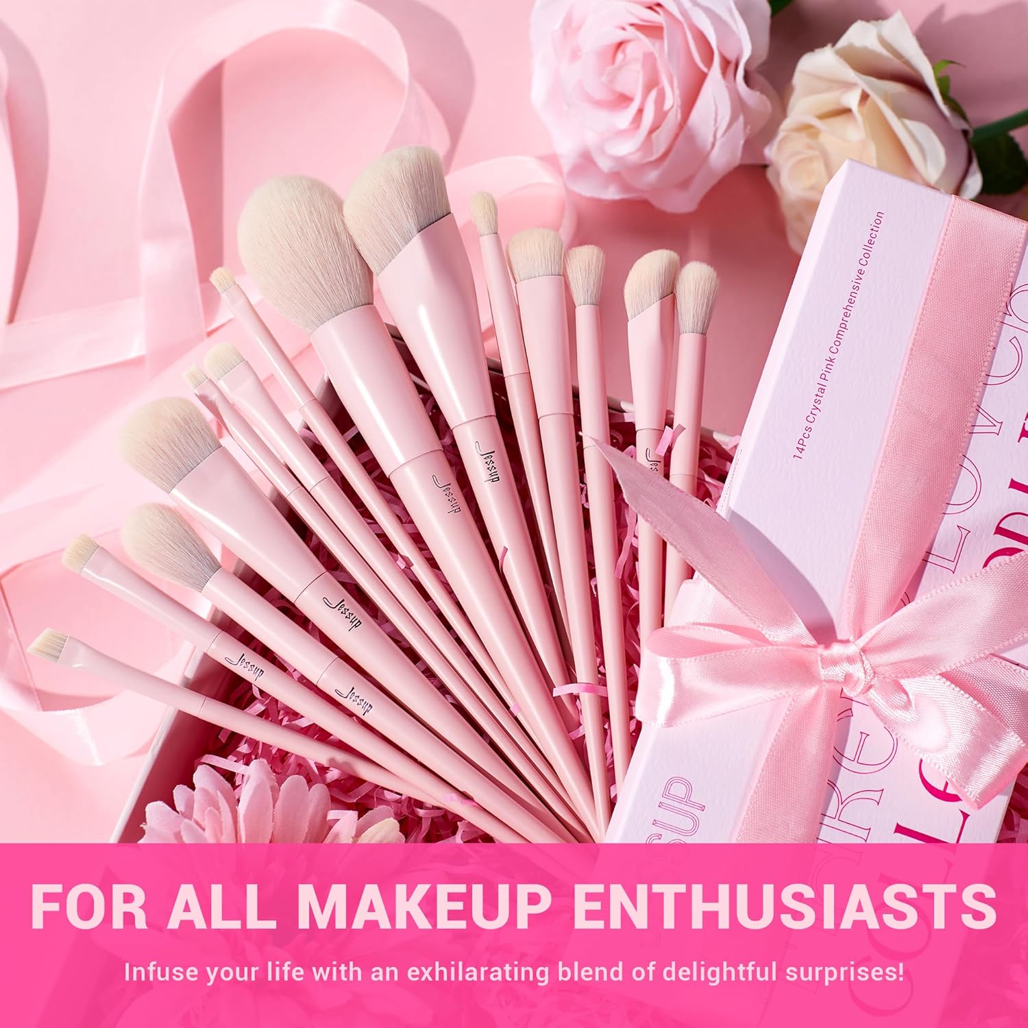Jessup Pink Makeup Brushes Set 14Pcs Make up Brushes Premium Vegan Foundation Concealer Blush Eyeshadow Eyeliner Powder Highlighter Blending Face Brush Set, T495