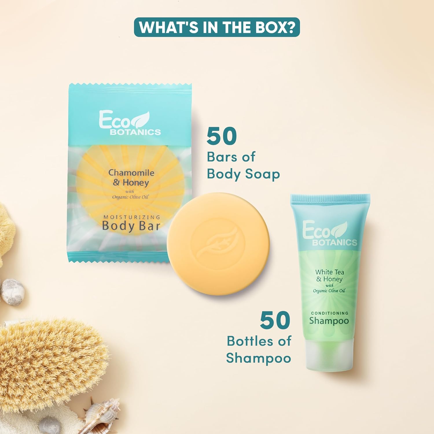 - IN THE BOX: This 100 piece mini toiletries set has everything you need to keep your guests comfortable. Your hotel kit includes 50 of each: Soap Bar & Conditioning Shampoo. Naturally scented with chamomile and honey for an invigorating and refreshing scent!