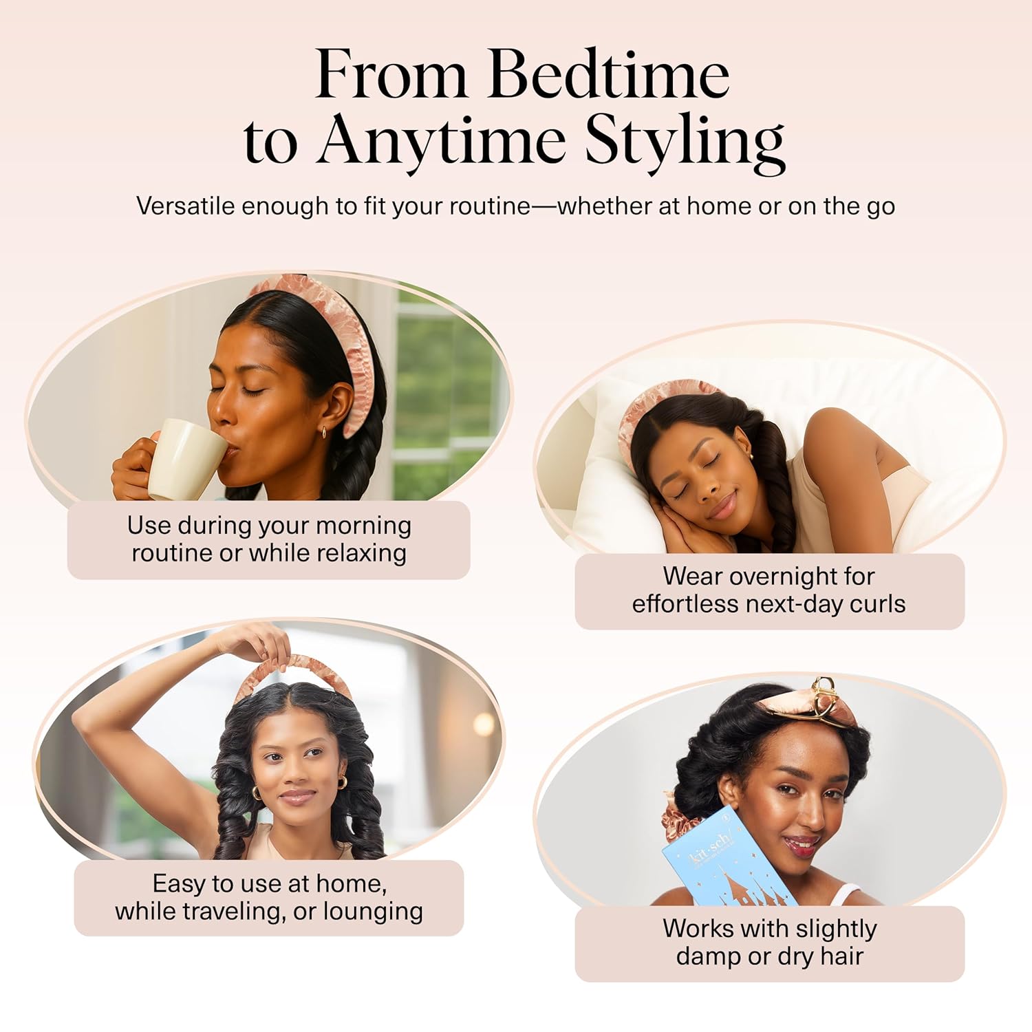 - BYE-BYE HAIR DAMAGE: Protect your hair from heat damage with the Kitsch Overnight Hair Curler. This set includes a curling rod and two satin scrunchies, all wrapped in premium satin fabric to keep your hair smooth and frizz-free while creating gorgeous, heat-free curls.