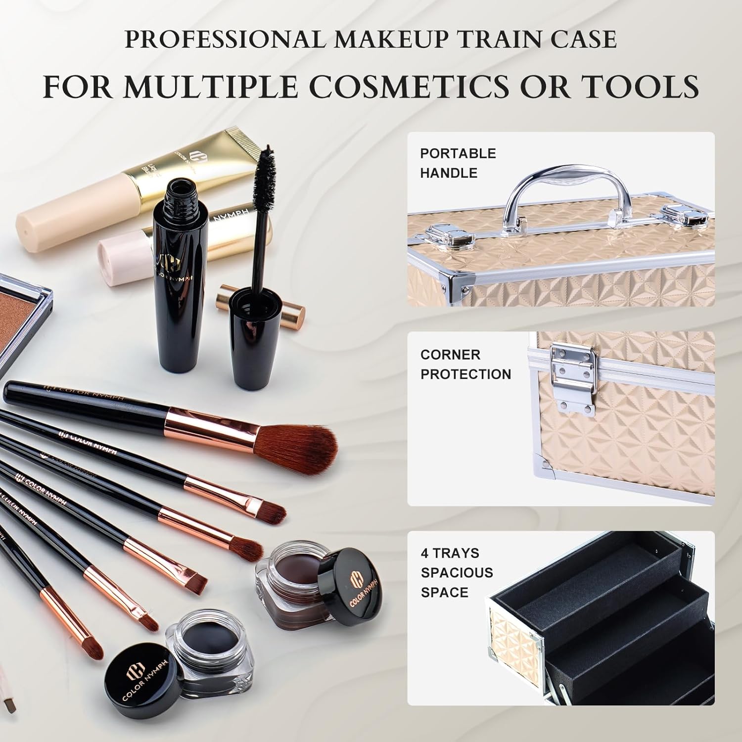 - Recyclable Gold Train Case, Large Capacity: Professional Full makeup kits comes with a large capacity train case and recyclable using. The train case organizers are a great fit for cosmetologist aesthetic supplies, nail techs, personal makeup organizer, traveling makeup box, makeup students, storage tool box and more.
