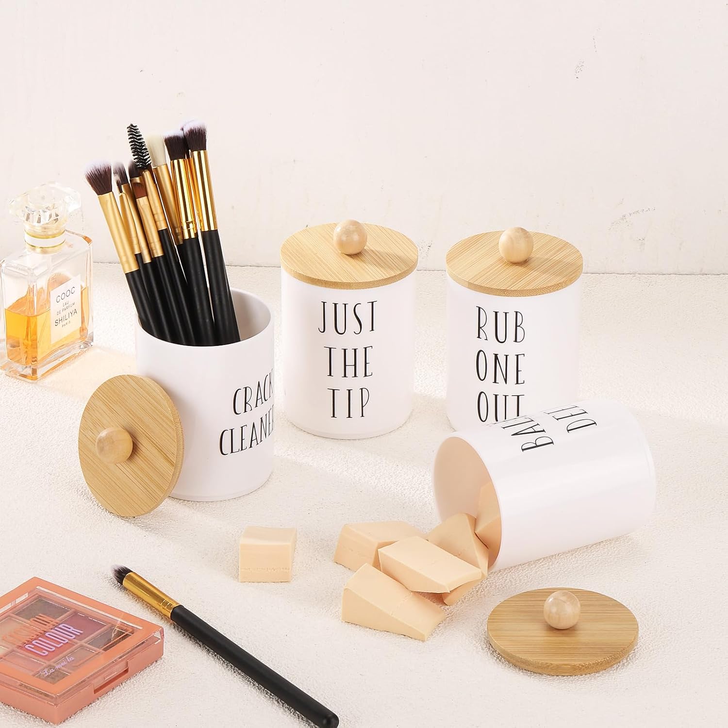 Tbestmax 4 Pack Qtip Holder Dispenser White Plastic Apothecary Jars for Bathroom Organizer, 10oz Storage Containers for Cotton Ball, Cotton Swab, Floss