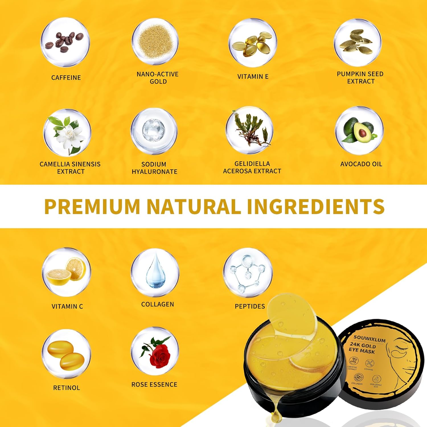 - Premium Ingredients Eye Mask Skincare: These eye patches for wrinkles feature holy grail ingredients, including mica gold, hyaluronic acid, caffeine, pumpkin seed extract, avocado oil, gelidiella acerosa extract, camellia sinensis leaf extract, peptides, collagen, multiple vitamins, known for their age-defying properties. As a result, these gold under eye patches provide all-in-one nourishment and treatment, targeting under eye puffiness, dark circles, and other signs of aging.