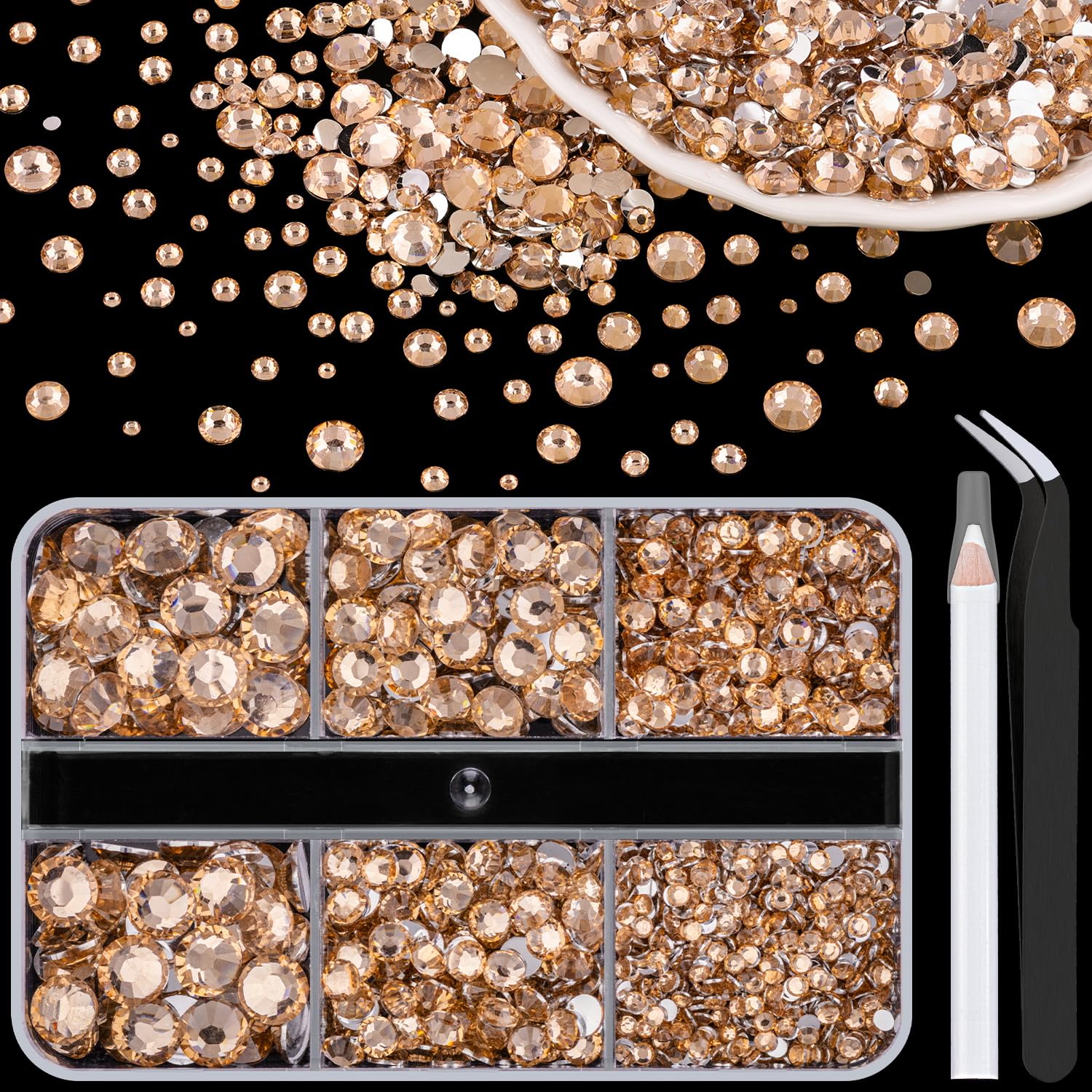- 💎PACKAGE CONTENT -- This resin rhinestone package includes 1 box with 6 grids, featuring a variety of sizes: 2mm x 1 grid, 3mm x 1 grid, 4mm x 1 grids, 5mm x 1 grids, and 6mm x 2 grids. 1 tweezers and 1 pickup pen are included for easily picking up of rhinestones. This set offers more large-sized gems, making it perfect for DIY craft decorations, eye makeup, face makeup and nail art.