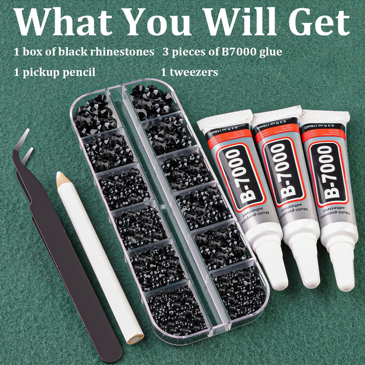 - 🖤WHAT YOU WILL GET -- The package includes 1 box of flatback rhinestones with 12 grids in diffrent sizes:2mm x 2 grids, 3mm x 3 grids, 4mm x 3 grids, 5mm x 2 grids, 6mm x 2 grids. 1 tweezers for large size gems, 1 pickup pen for small size gems. 3 B7000 adhesive jewels glue for jewelry making.This rhinestone kit makes it easy for you to make any craft you like, and will bedazzle your artworks!