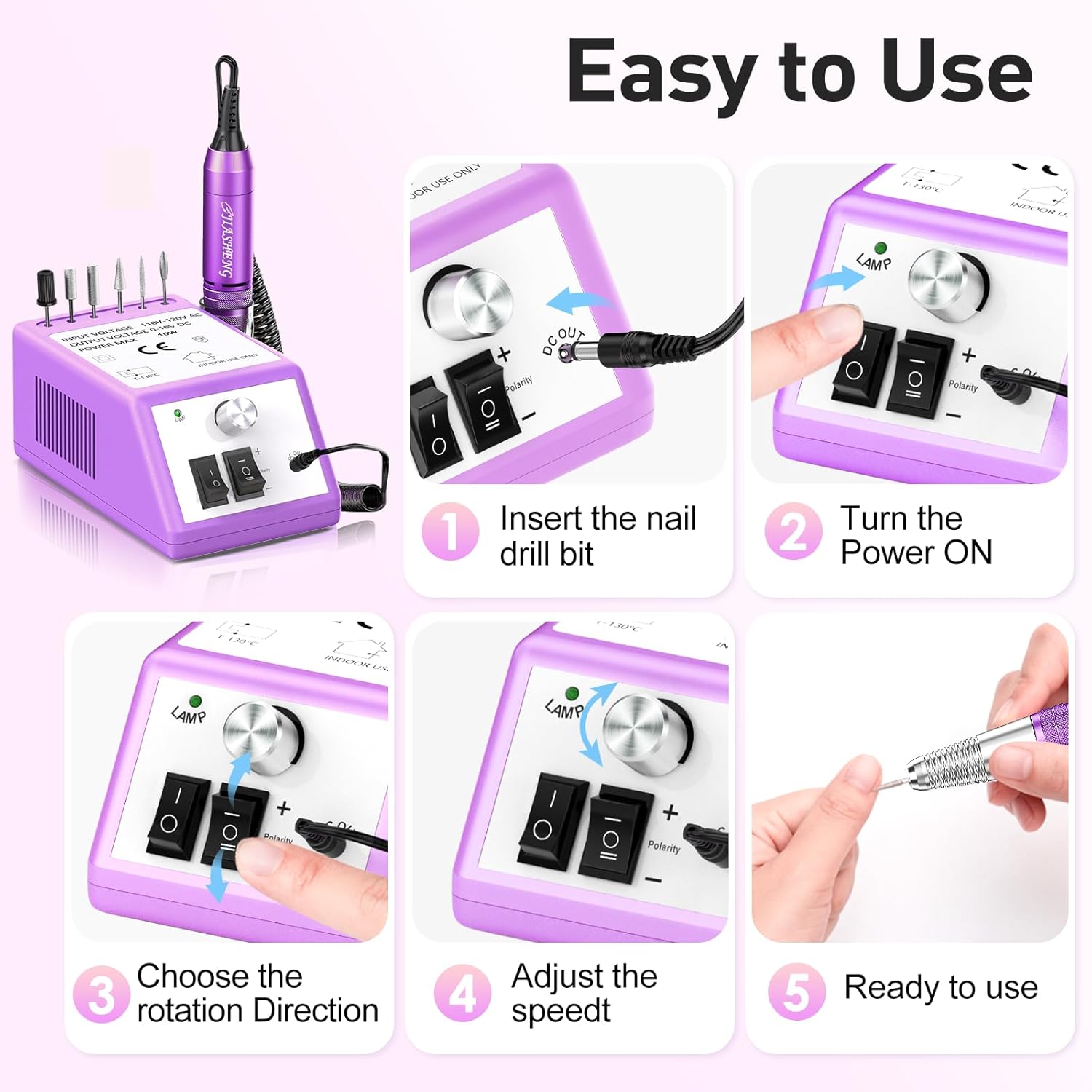- Compact Electric Grinding File:Nail drills for acrylic nails are compact enough for your desk, our nail drill machine designed with 6 nail drill bits holder and hand piece holder, it is more convenient for your manicure and pedicure