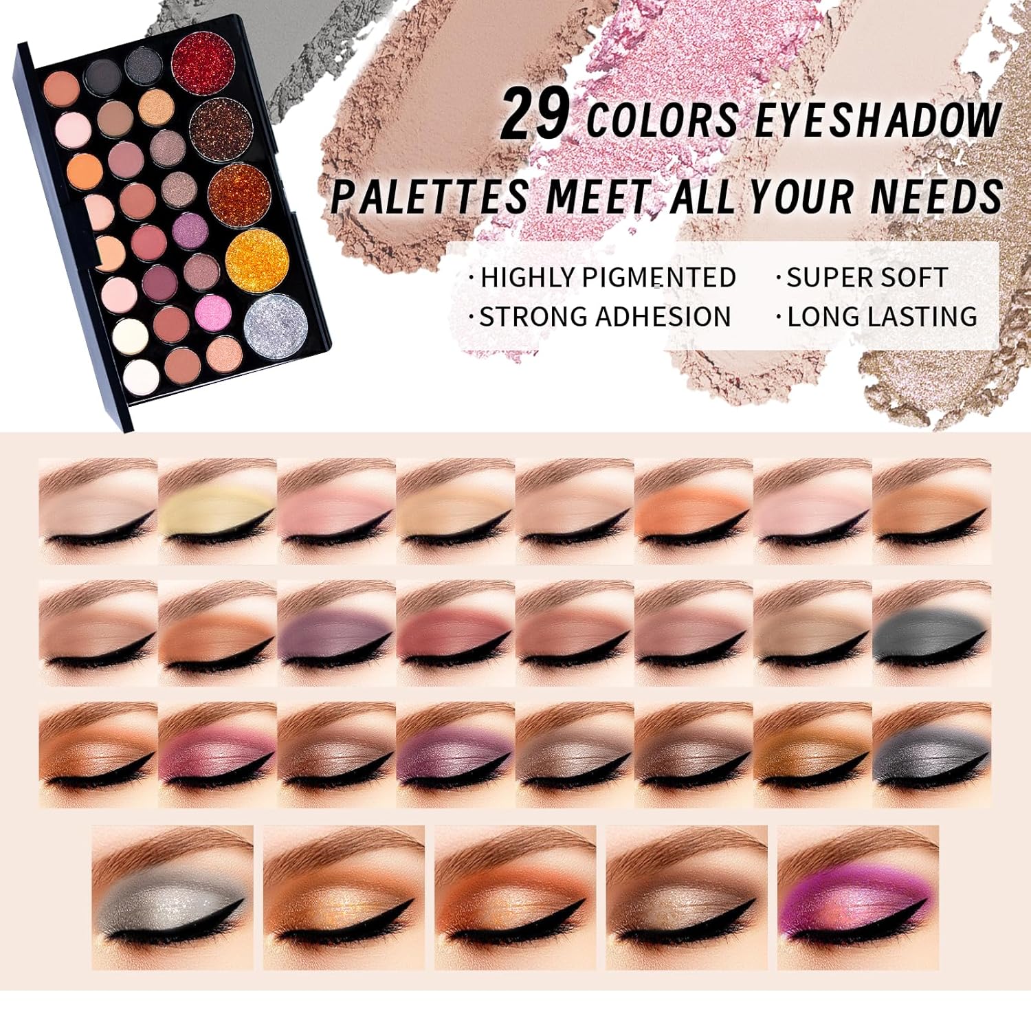 - [Professional Makeup Set] The professional makeup set includes full coverage natural & buff beige foundation, 29 colors matte & shimmer eyeshadow palette, 12 colors matte velvet liquid lipsticks set, face primer, 3 in 1 highlighter contour blush palette, 6 color correcting palette, eyebrow soap, dual-ended eyebrow pencil, winged eyeliner stamp, waterproof mascara, 13 pcs makeup brush & 2pcs makeup sponges. It can meet your different makeup needs.