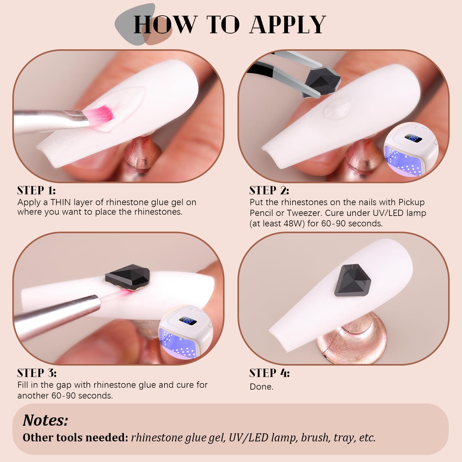 - 💎EASY TO USE -- Easy to apply on artificial nails. After applying nail polish and applying enough gel on the nails, simply use the equipped tools (pickup pen + tweezers) to pick up the crystals onto your nails to create your fabulous DIY designs! These crystals gemstones are different from those hotfix stones, they are not self-adhesive, you have to apply glue to stick them (glue is not included.)