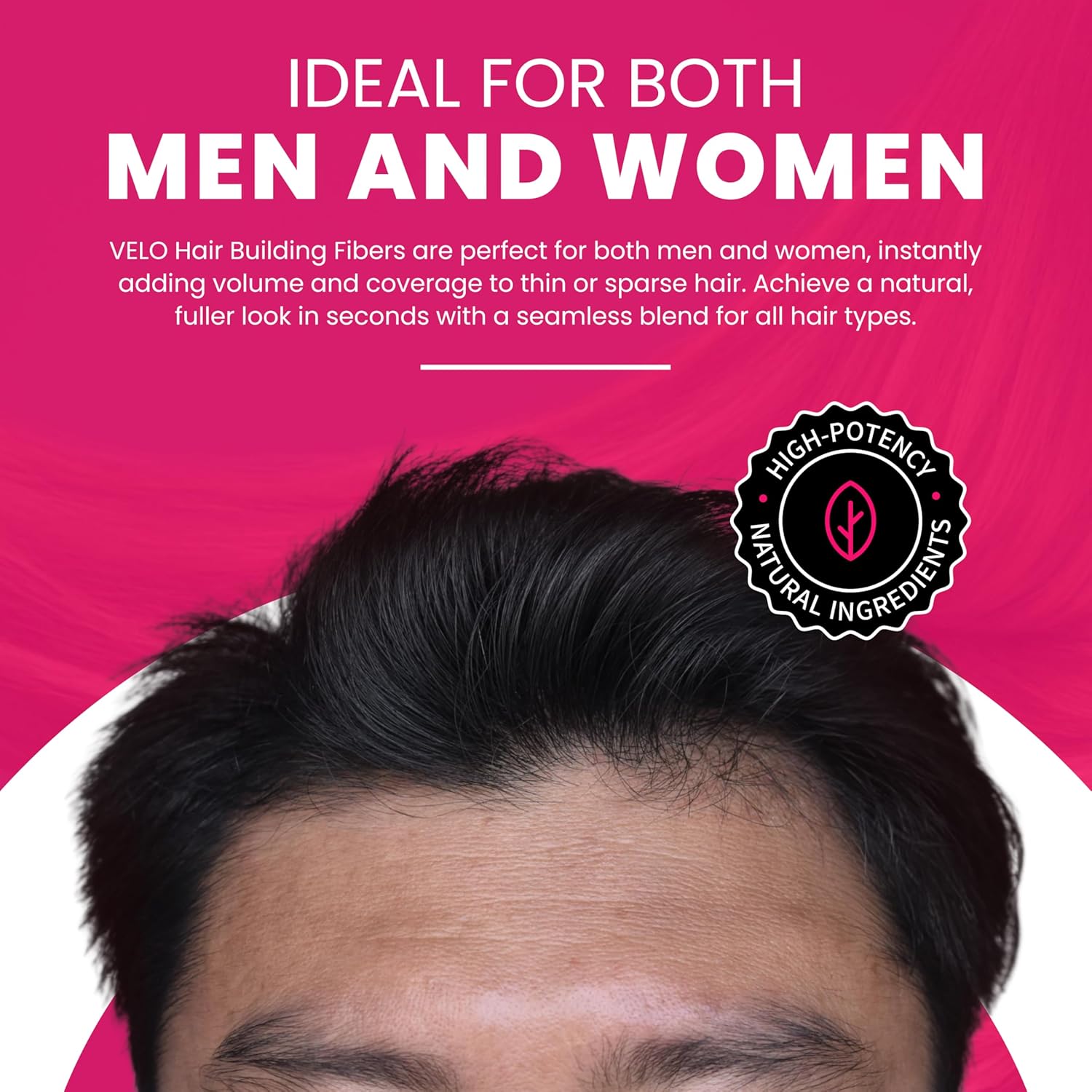 - INSTANTLY FULLER-LOOKING HAIR: VELO Hair Building Fibers help create the appearance of thicker, fuller hair by naturally blending with existing strands. Perfect for thinning areas and enhancing overall hair volume.